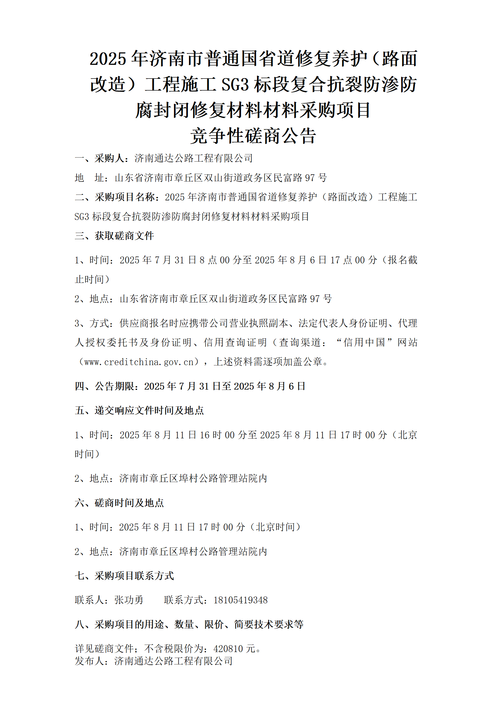 2025年濟(jì)南市普通國(guó)省道修復(fù)養(yǎng)護(hù)(路面改造)工程施工SG3標(biāo)段復(fù)合抗裂防滲防腐封閉修復(fù)材料材料采購(gòu)項(xiàng)目競(jìng)爭(zhēng)性磋商公告