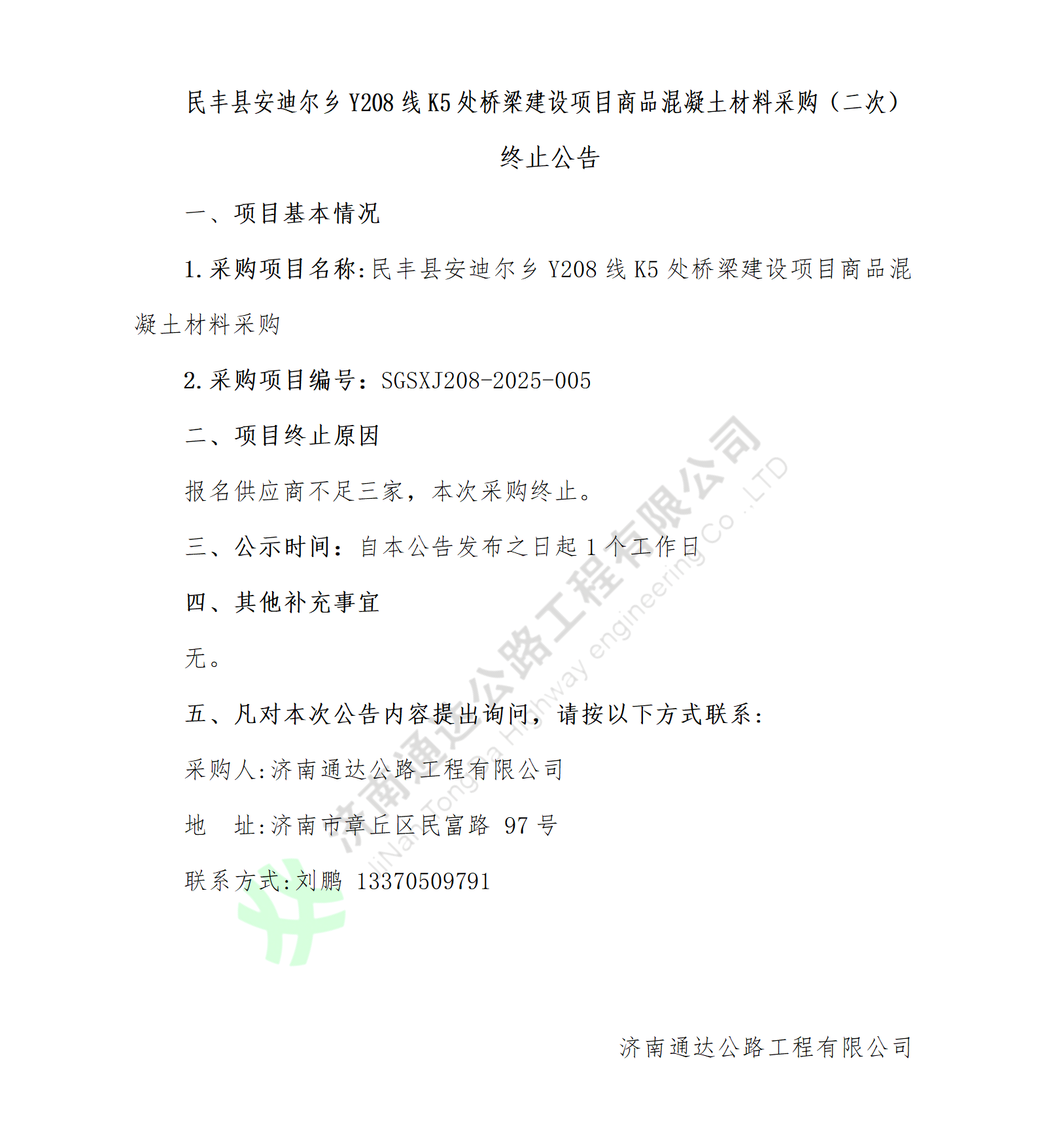 民豐縣安迪爾鄉(xiāng)Y208線K5處橋梁建設(shè)項(xiàng)目商品混凝土材料采購(gòu)(二次)終止公告