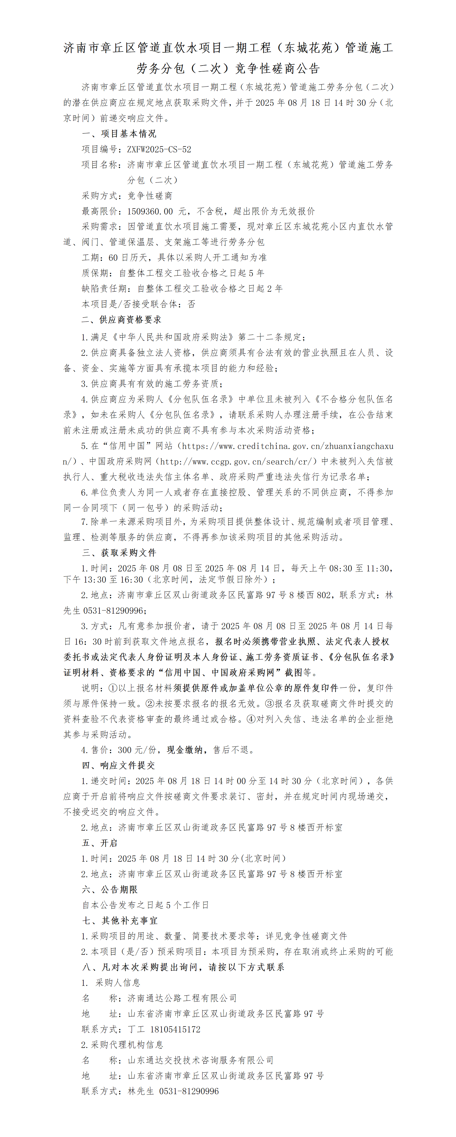 濟(jì)南市章丘區(qū)管道直飲水項(xiàng)目一期工程(東城花苑)管道施工勞務(wù)分包(二次)競(jìng)爭(zhēng)性磋商公告