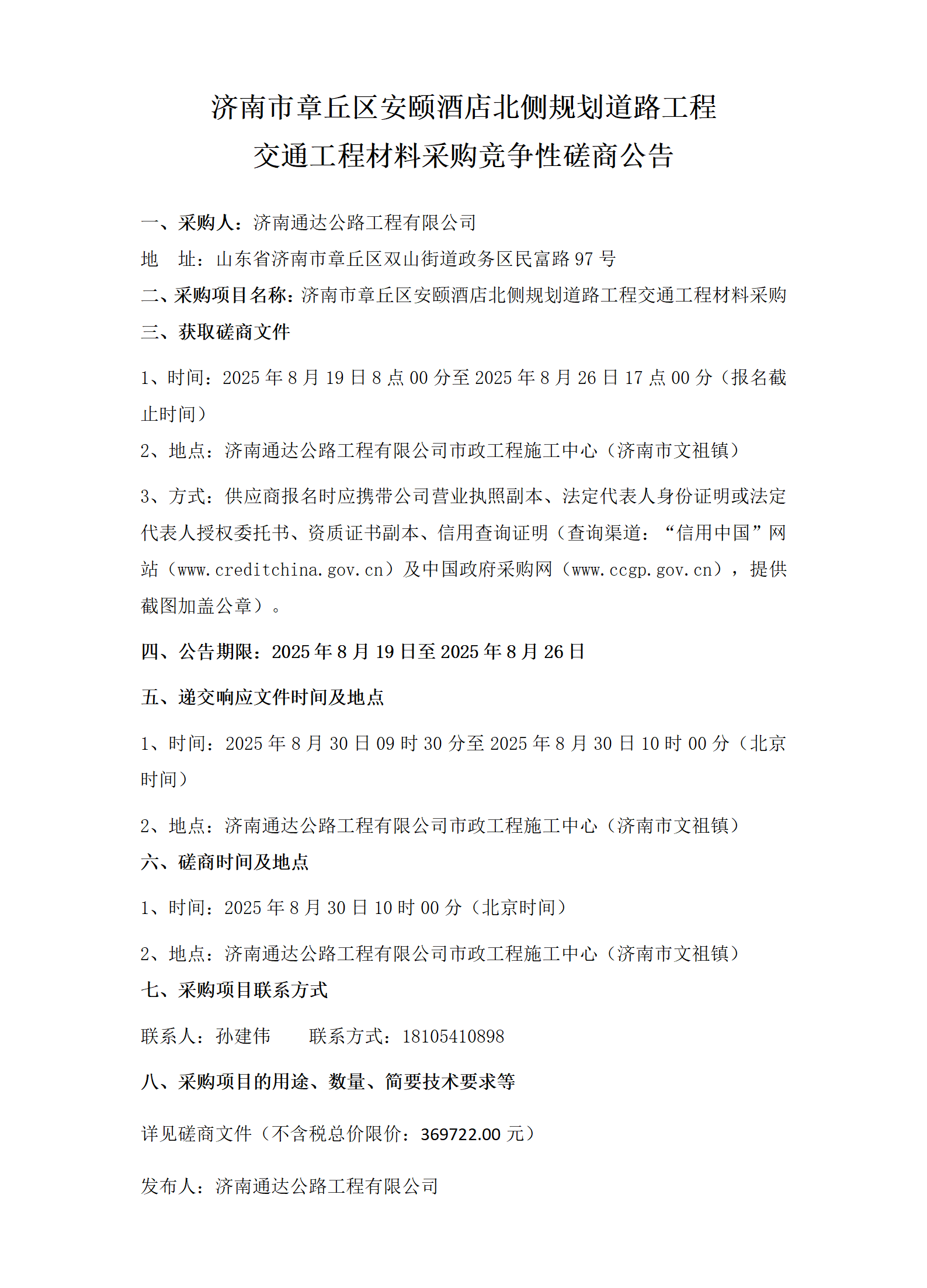 濟南市章丘區(qū)安頤酒店北側(cè)規(guī)劃道路工程交通工程材料采購競爭性磋商公告