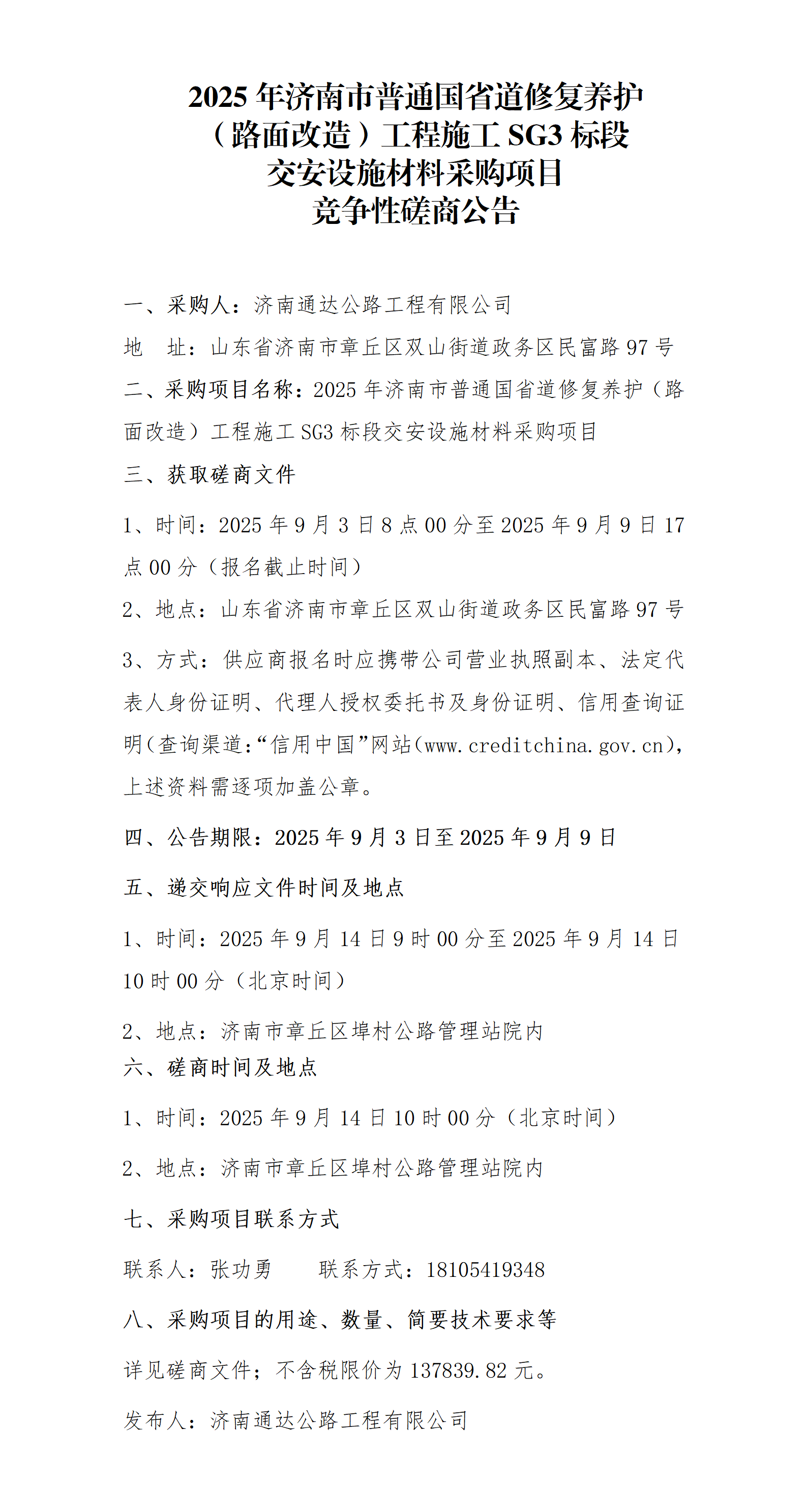 2025濟(jì)南市普通國(guó)省道養(yǎng)護(hù)(路面改造)工程施工SG3標(biāo)段交安設(shè)施材料采購(gòu)項(xiàng)目競(jìng)爭(zhēng)性磋商公告