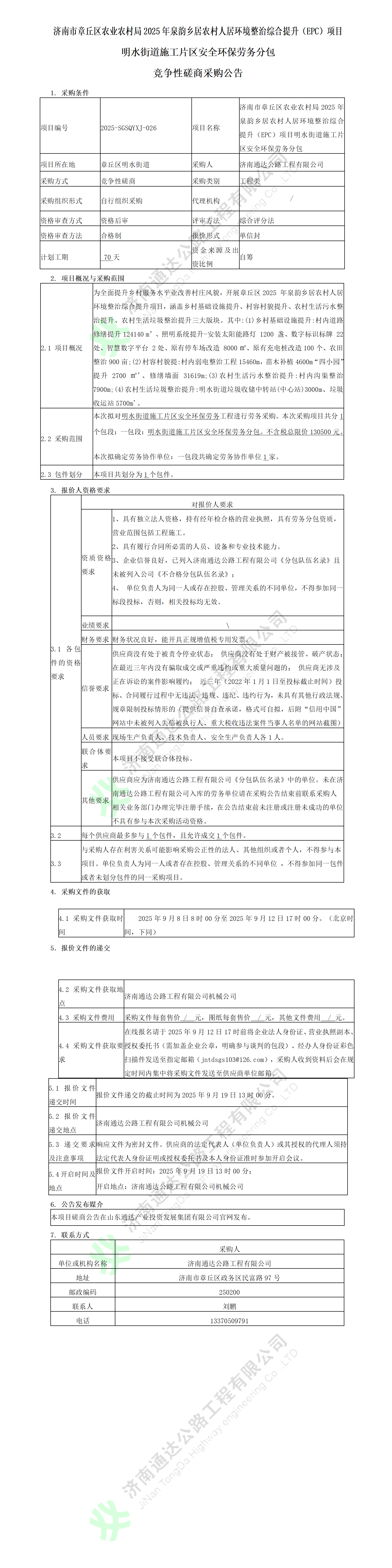 濟南市章丘區(qū)農(nóng)業(yè)農(nóng)村局2025年泉韻鄉(xiāng)居農(nóng)村人居環(huán)境整治綜合提升(EPC)項目明水街道施工片區(qū)安全環(huán)保勞務分包競爭性磋商采購公告