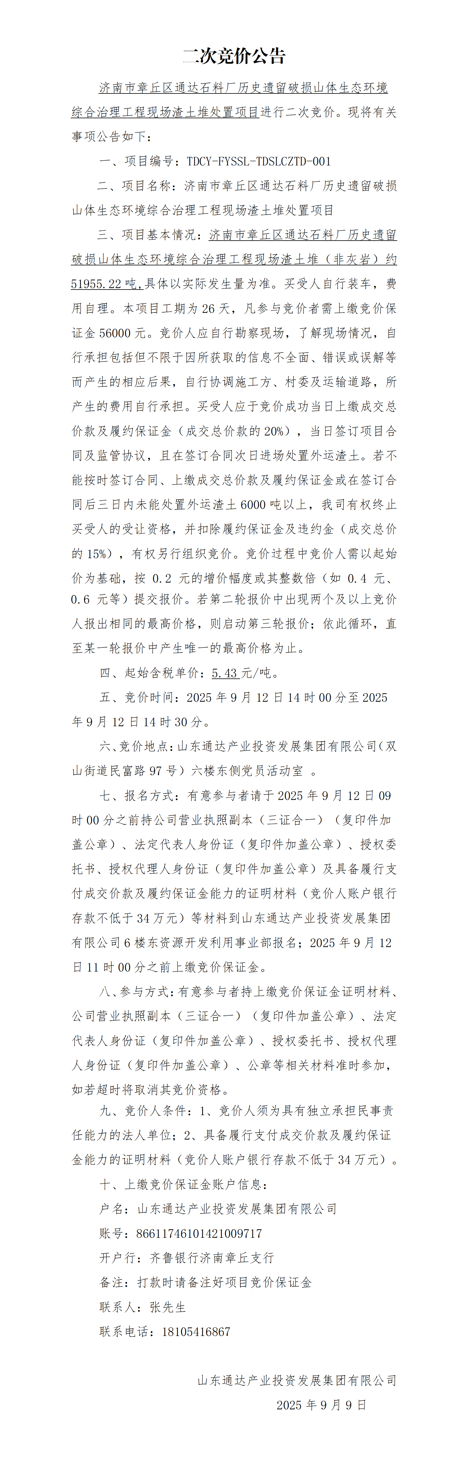 濟南市章丘區(qū)通達石料廠歷史遺留破損山體生態(tài)環(huán)境綜合治理工程現(xiàn)場渣土堆處置項目二次競價公告