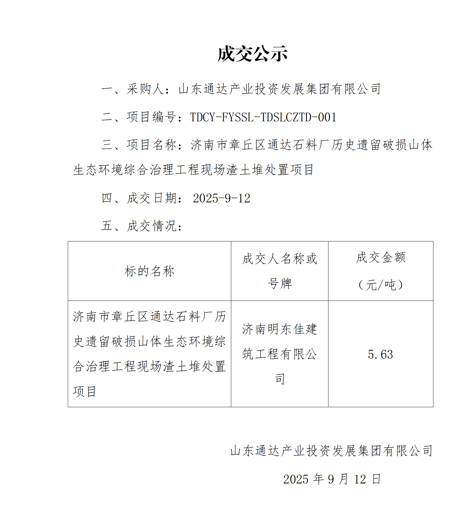 濟(jì)南市章丘區(qū)通達(dá)石料廠歷史遺留破損山體生態(tài)環(huán)境綜合治理工程現(xiàn)場渣土堆處置項(xiàng)目成交公示