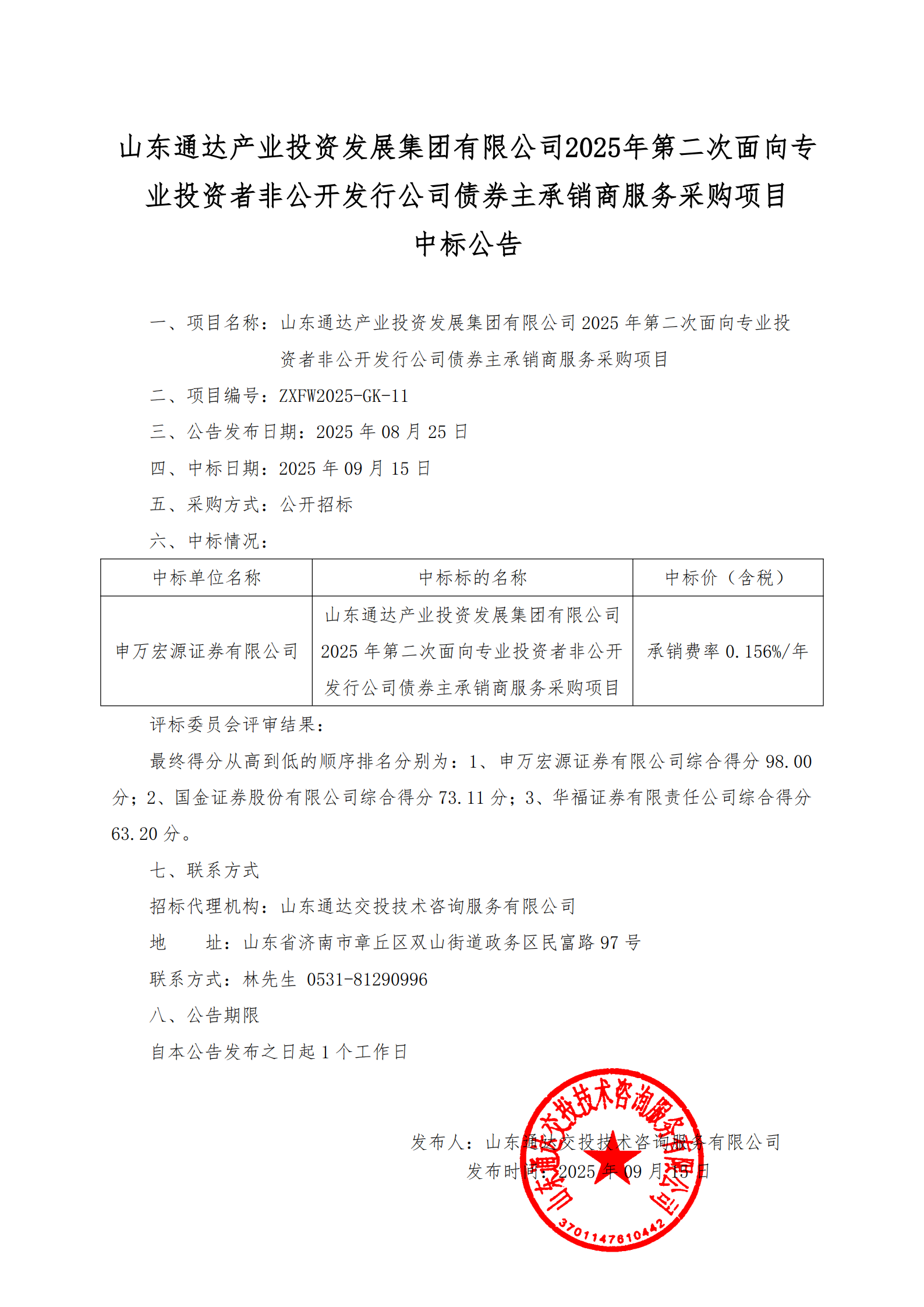 山東通達(dá)產(chǎn)業(yè)投資發(fā)展集團(tuán)有限公司2025年第二次面向?qū)I(yè)投資者非公開發(fā)行公司債券主承銷商服務(wù)采購項(xiàng)目中標(biāo)公告