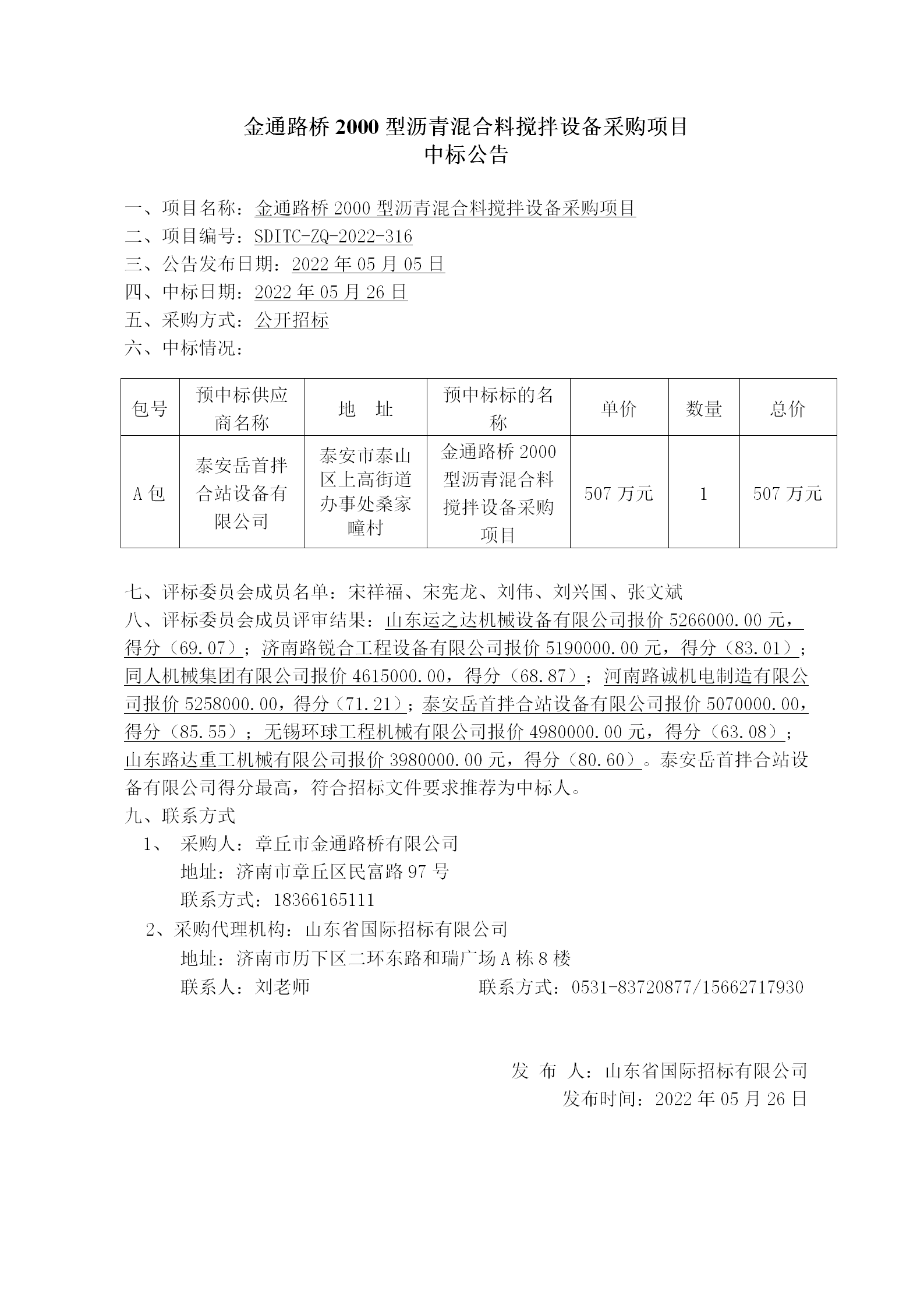 金通路橋2000型瀝青混合料攪拌設備采購項目中標公告