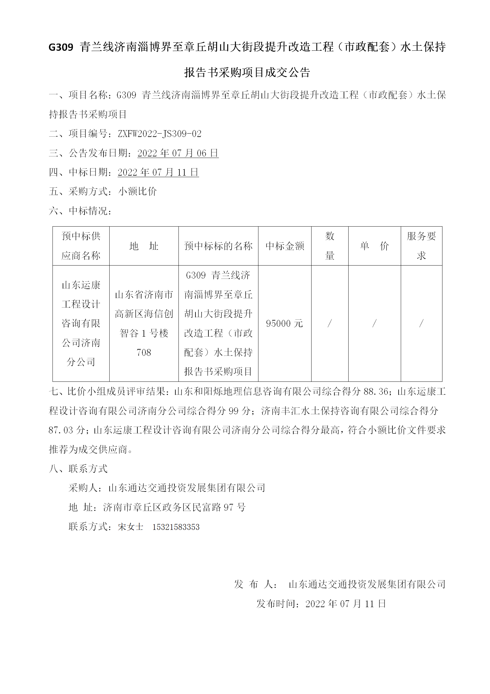 G309 青蘭線濟(jì)南淄博界至章丘胡山大街段提升改造工程(市政配套)水土保持報告書采購項(xiàng)目成交公告