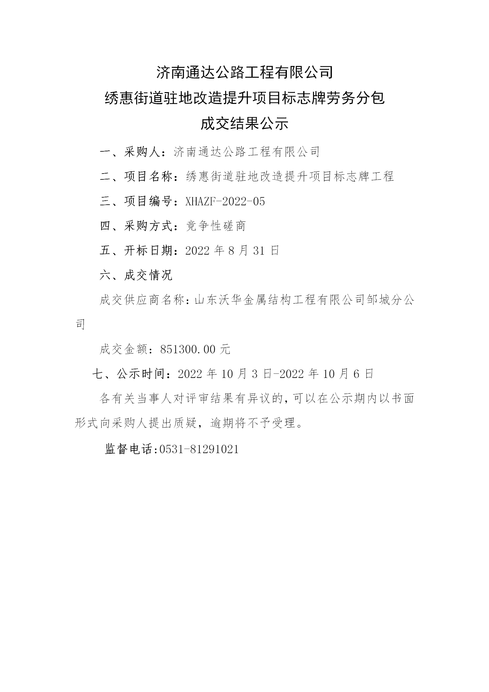 濟(jì)南通達(dá)公路工程有限公司 繡惠街道駐地改造提升項(xiàng)目標(biāo)志牌勞務(wù)分包 成交結(jié)果公示