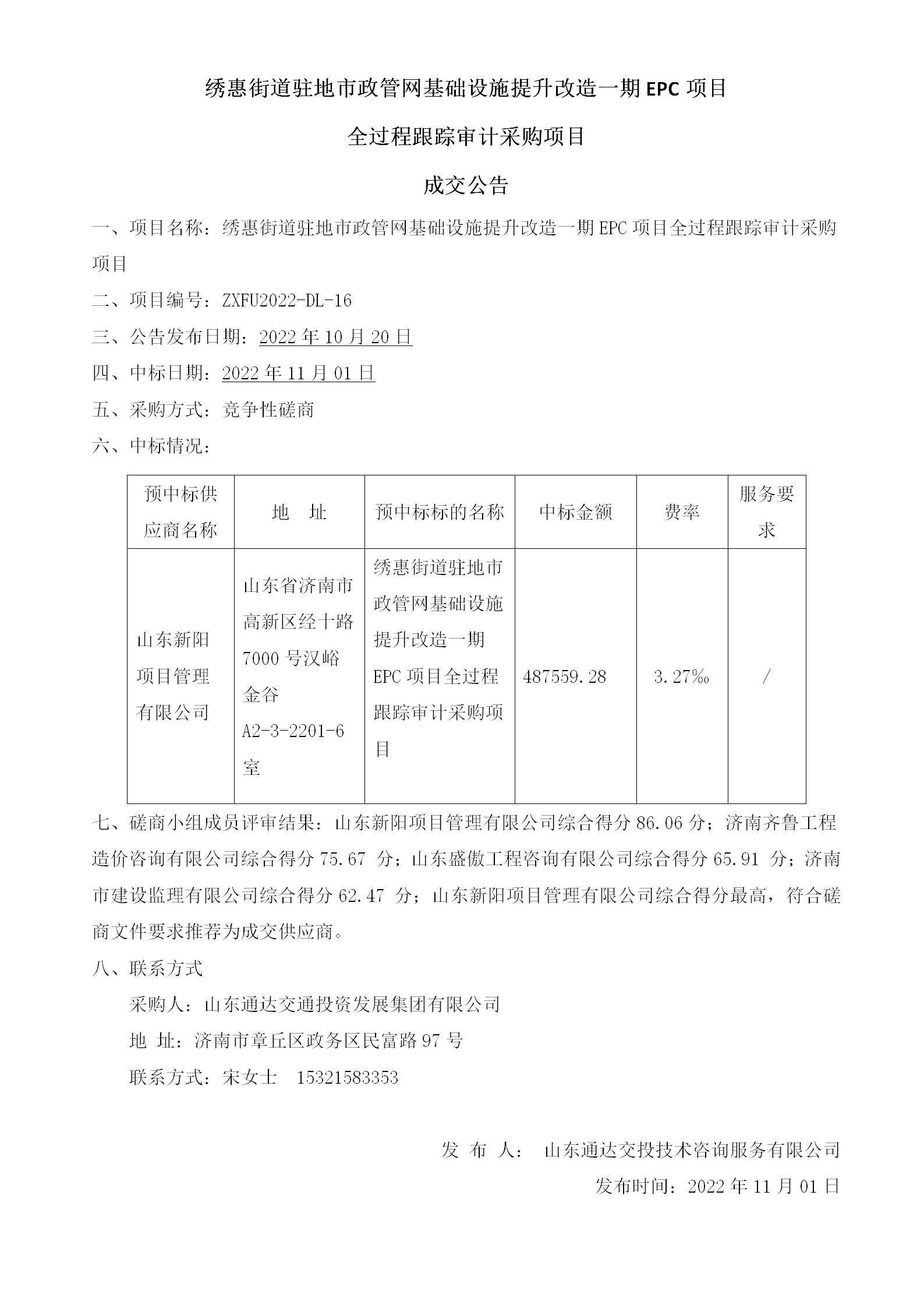 繡惠街道駐地市政管網(wǎng)基礎(chǔ)設(shè)施提升改造一期EPC項(xiàng)目 全過(guò)程跟蹤審計(jì)采購(gòu)項(xiàng)目 成交公告