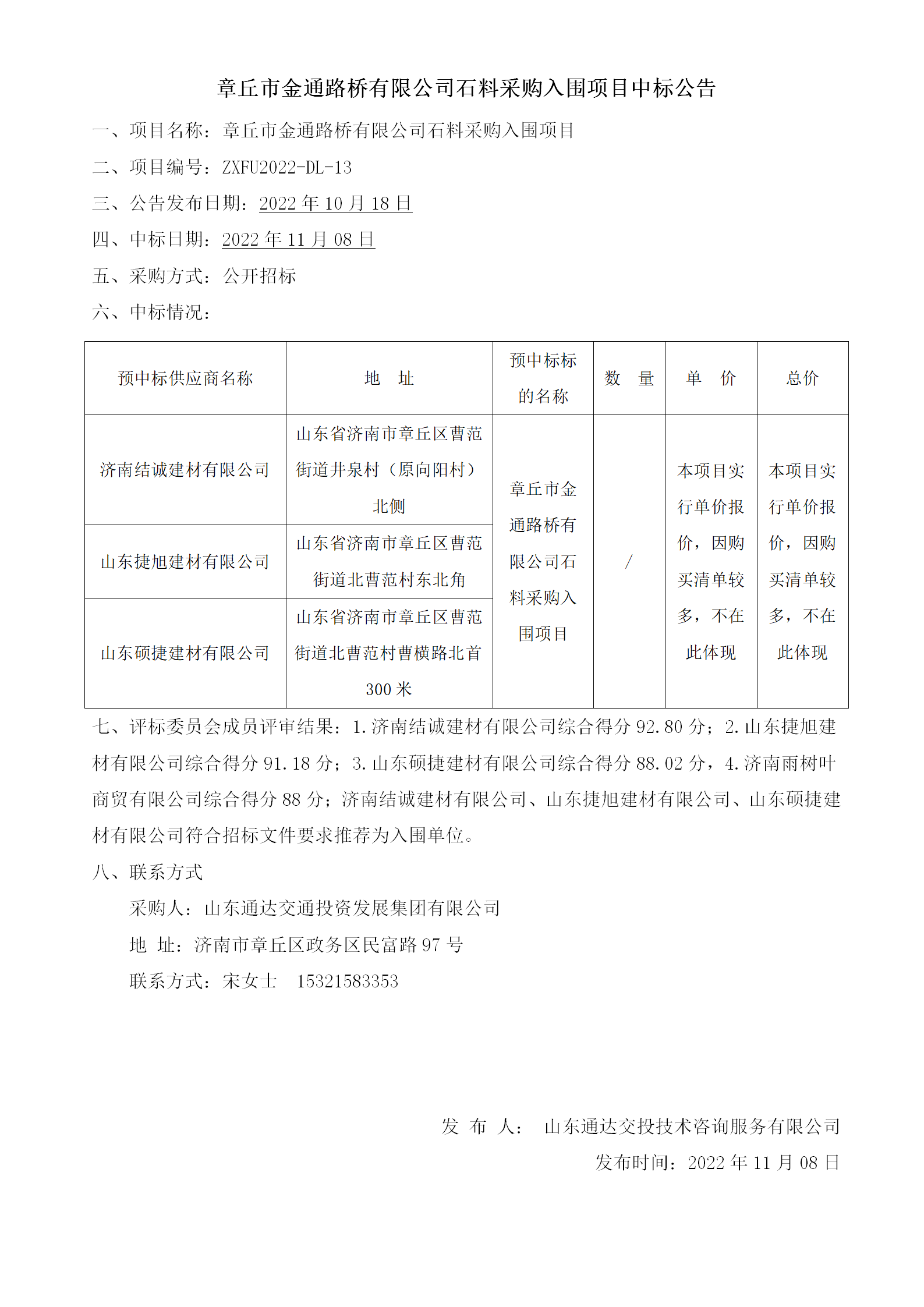 章丘市金通路橋有限公司石料采購入圍項目中標(biāo)公告