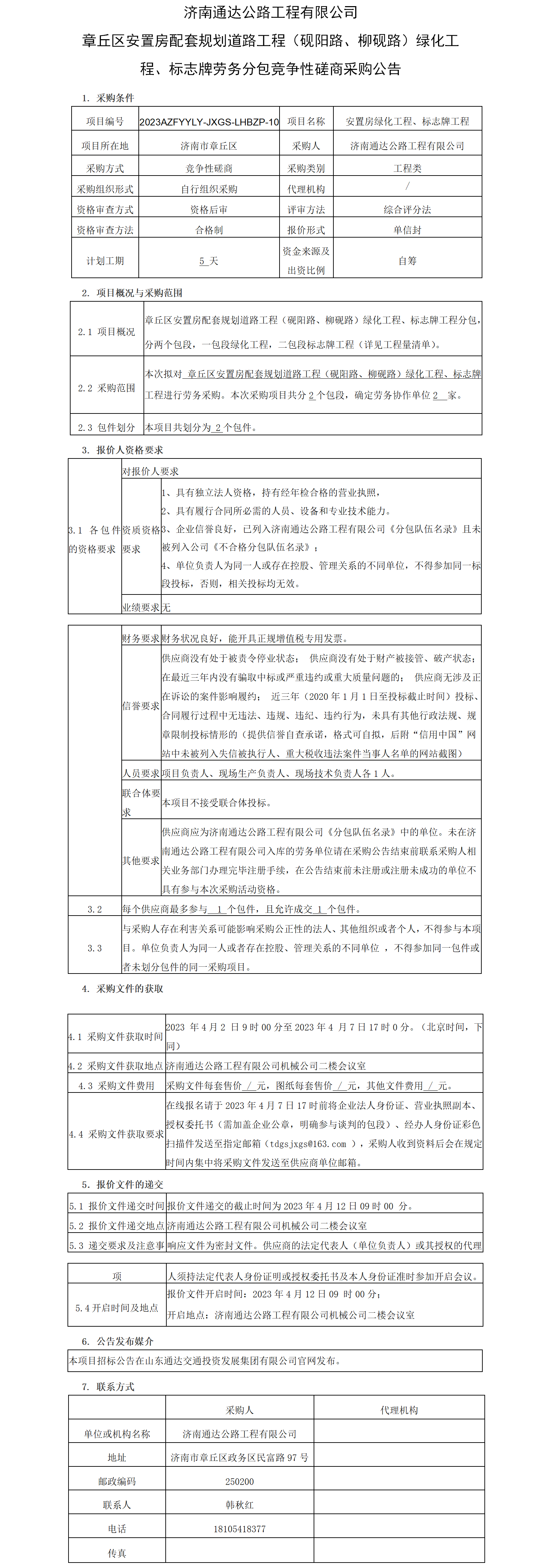 濟南通達公路工程有限公司 章丘區(qū)安置房配套規(guī)劃道路工程(硯陽路、柳硯路)綠化工程、標志牌勞務(wù)分包競爭性磋商采購公告