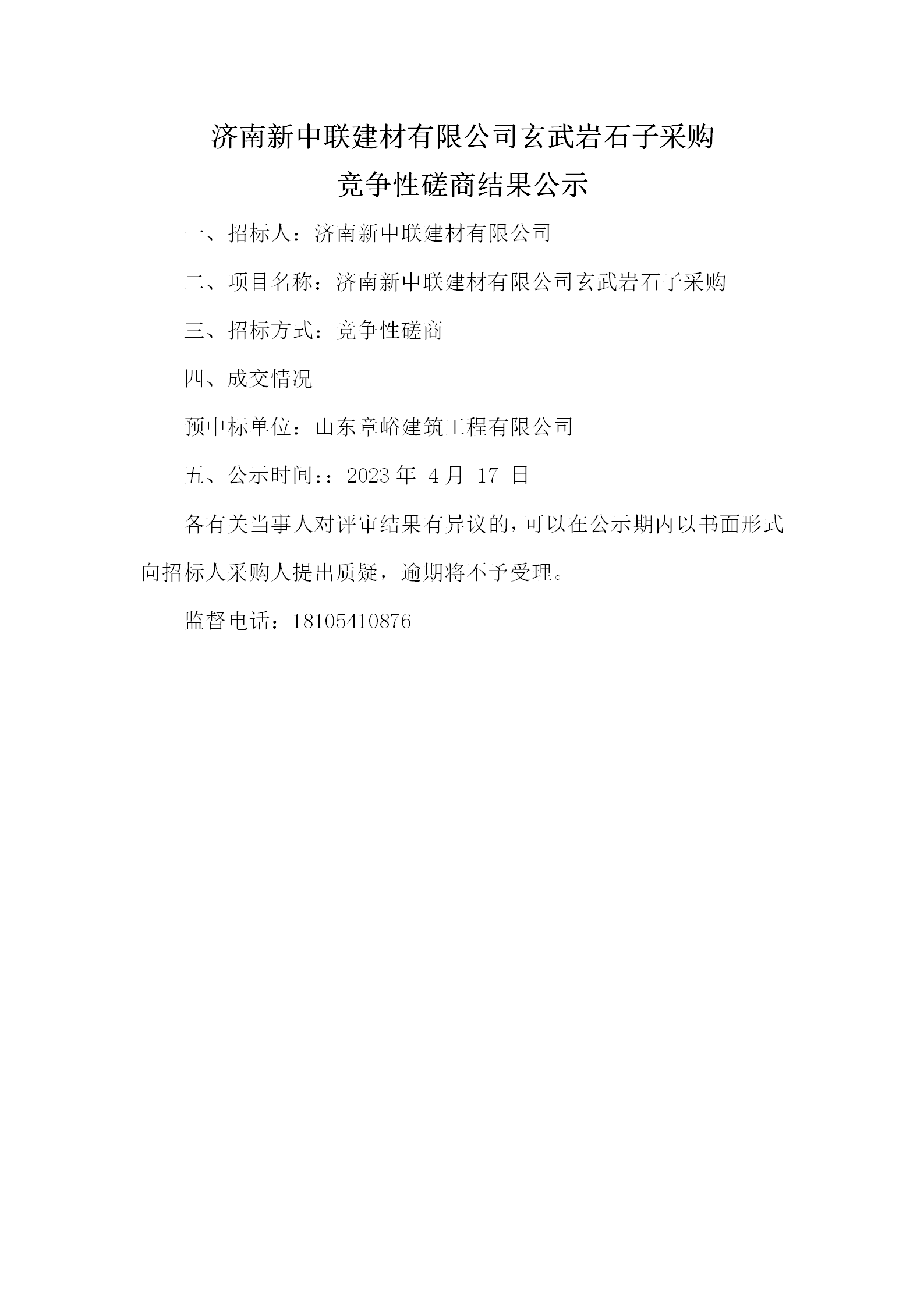 濟(jì)南新中聯(lián)建材有限公司玄武巖石子采購 競(jìng)爭(zhēng)性磋商結(jié)果公示