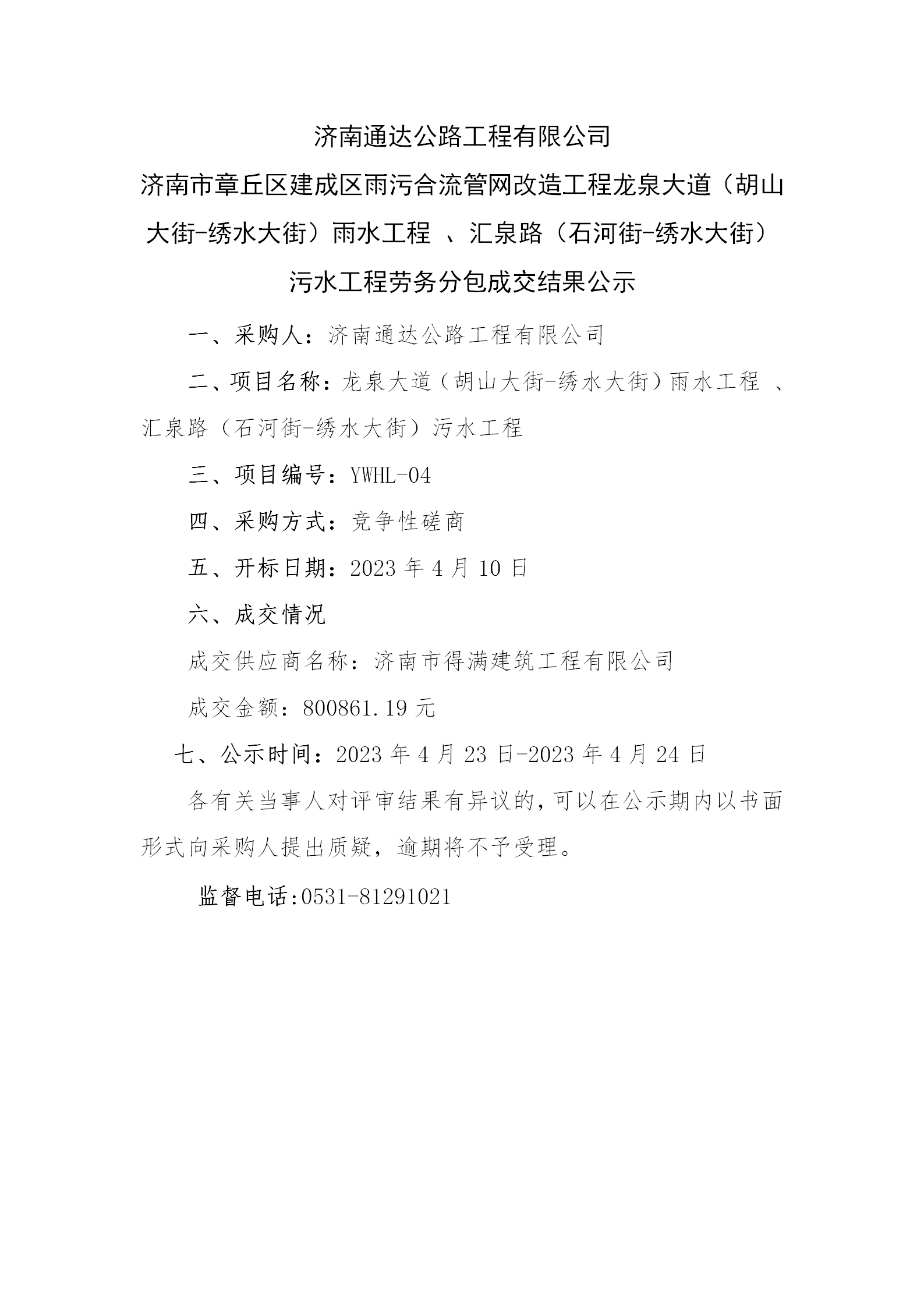濟(jì)南通達(dá)公路工程有限公司 濟(jì)南市章丘區(qū)建成區(qū)雨污合流管網(wǎng)改造工程龍泉大道(胡山大街-繡水大街)雨水工程 、匯泉路(石河街-繡水大街)污水工程勞務(wù)分包成交結(jié)果公示