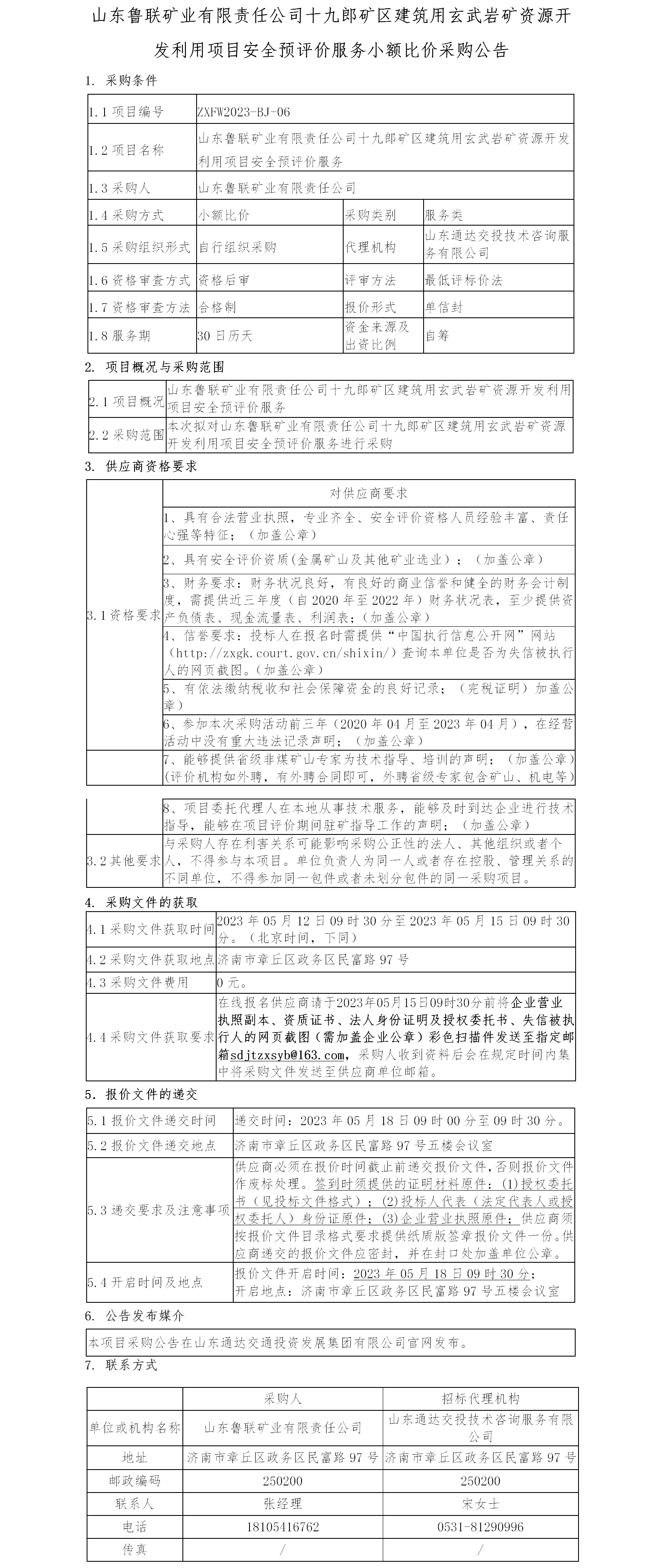 山東魯聯(lián)礦業(yè)有限責任公司十九郎礦區(qū)建筑用玄武巖礦資源開發(fā)利用項目安全預(yù)評價服務(wù)小額比價采購公告