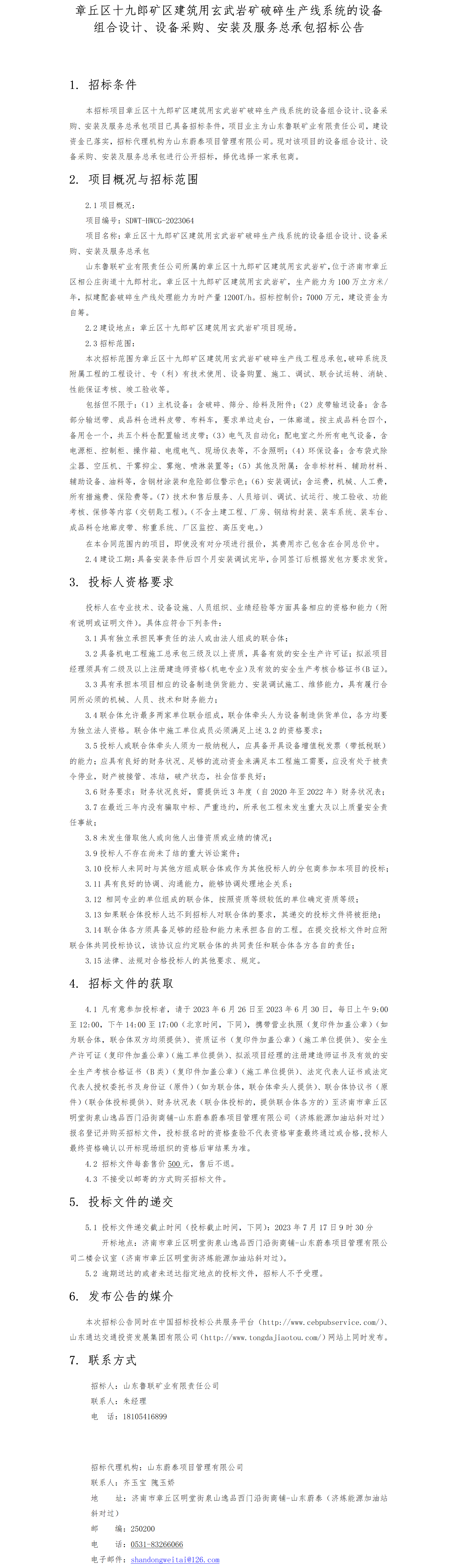 章丘區(qū)十九郎礦區(qū)建筑用玄武巖礦破碎生產(chǎn)線(xiàn)系統(tǒng)的設(shè)備組合設(shè)計(jì)、設(shè)備采購(gòu)、安裝及服務(wù)總承包招標(biāo)公告