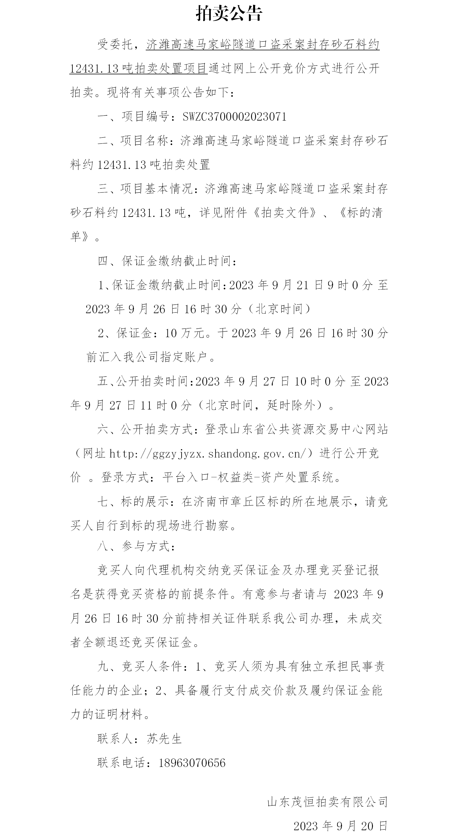 濟(jì)濰高速馬家峪隧道口盜采案封存砂石料約12431.13噸拍賣處置