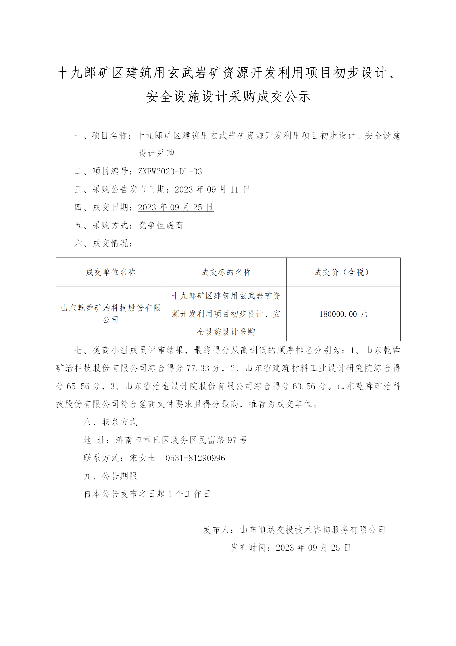 十九郎礦區(qū)建筑用玄武巖礦資源開發(fā)利用項目初步設計、安全設施設計采購成交公示