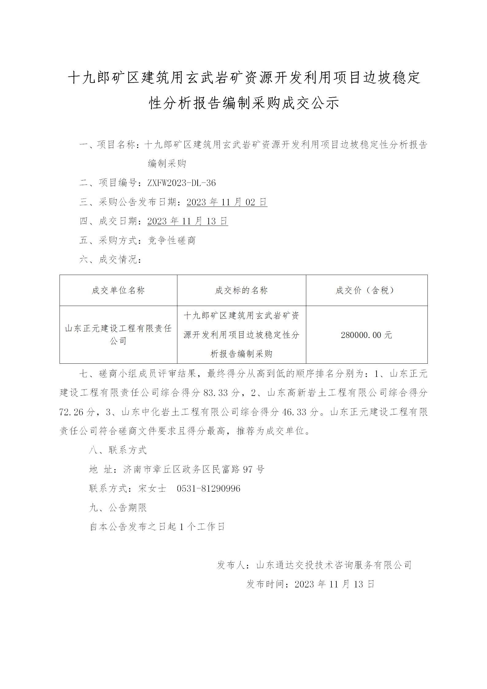 十九郎礦區(qū)建筑用玄武巖礦資源開發(fā)利用項目邊坡穩(wěn)定性分析報告編制采購成交公示