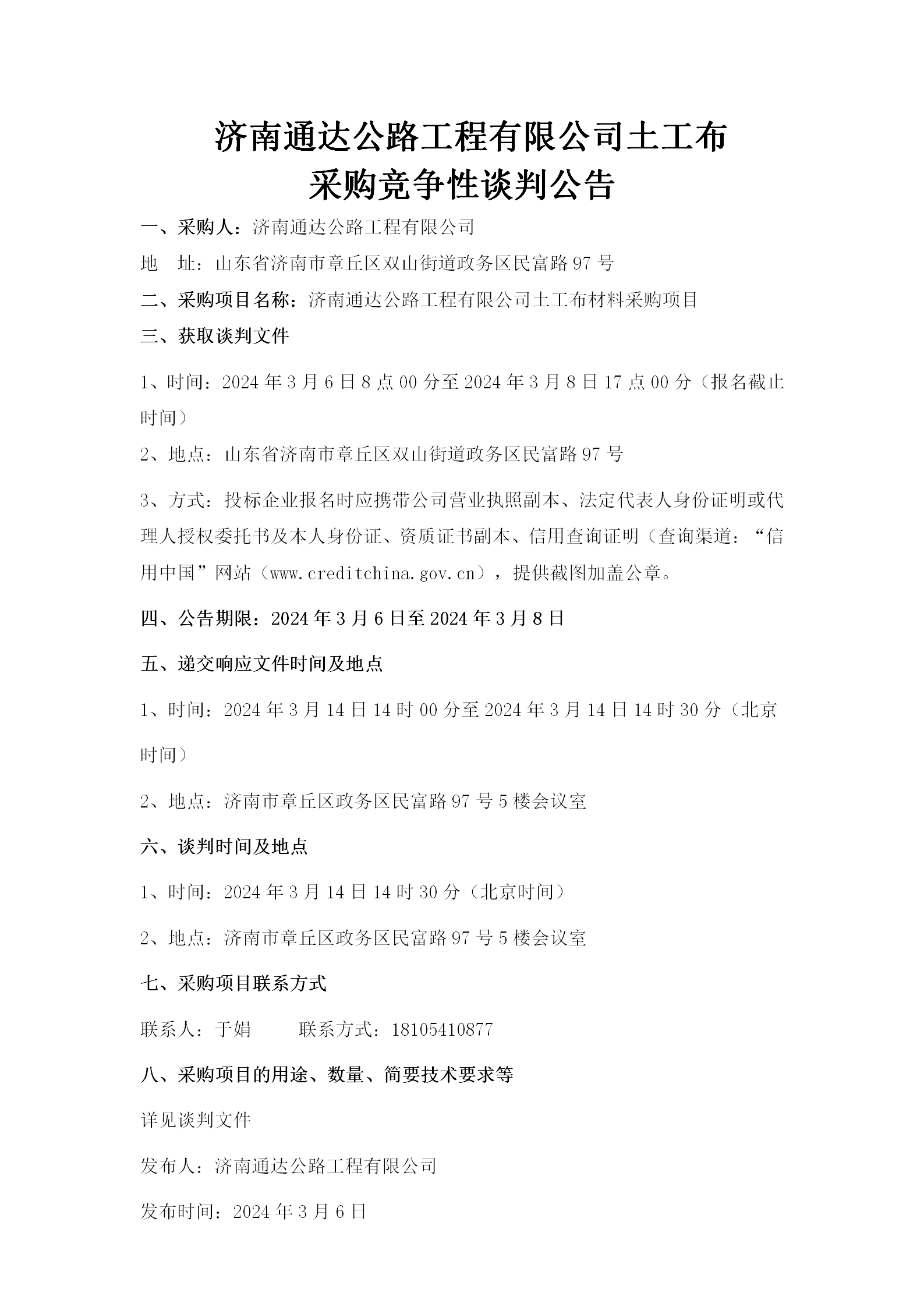 濟(jì)南通達(dá)公路工程有限公司土工布 采購(gòu)競(jìng)爭(zhēng)性談判公告