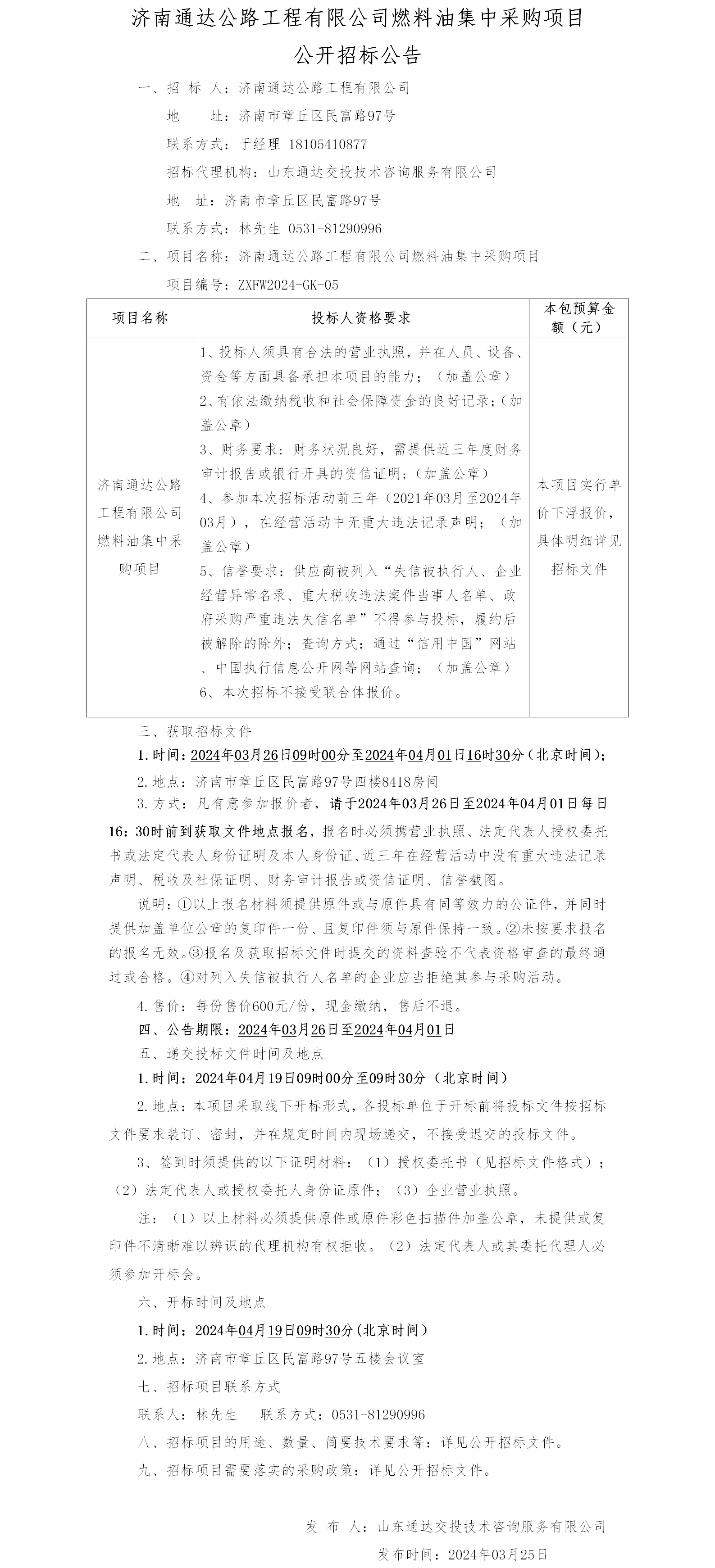 濟(jì)南通達(dá)公路工程有限公司燃料油集中采購(gòu)項(xiàng)目 公開(kāi)招標(biāo)公告