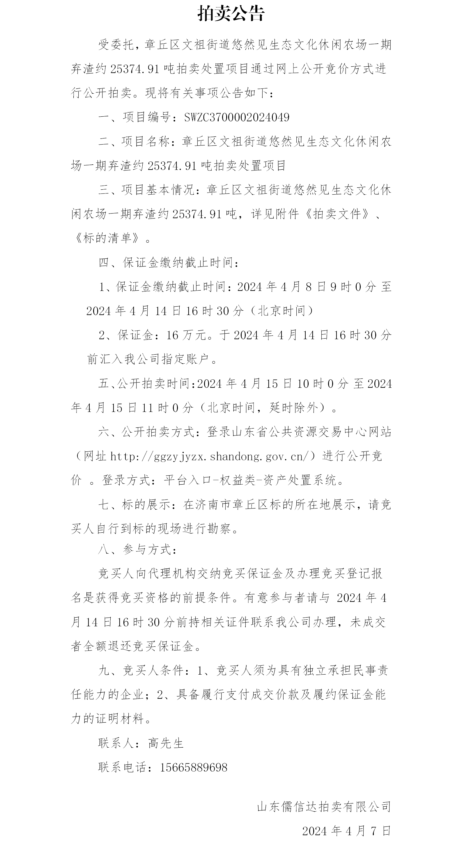 章丘區(qū)文祖街道悠然見生態(tài)文化休閑農(nóng)場一期棄渣約25374.91噸拍賣處置項目