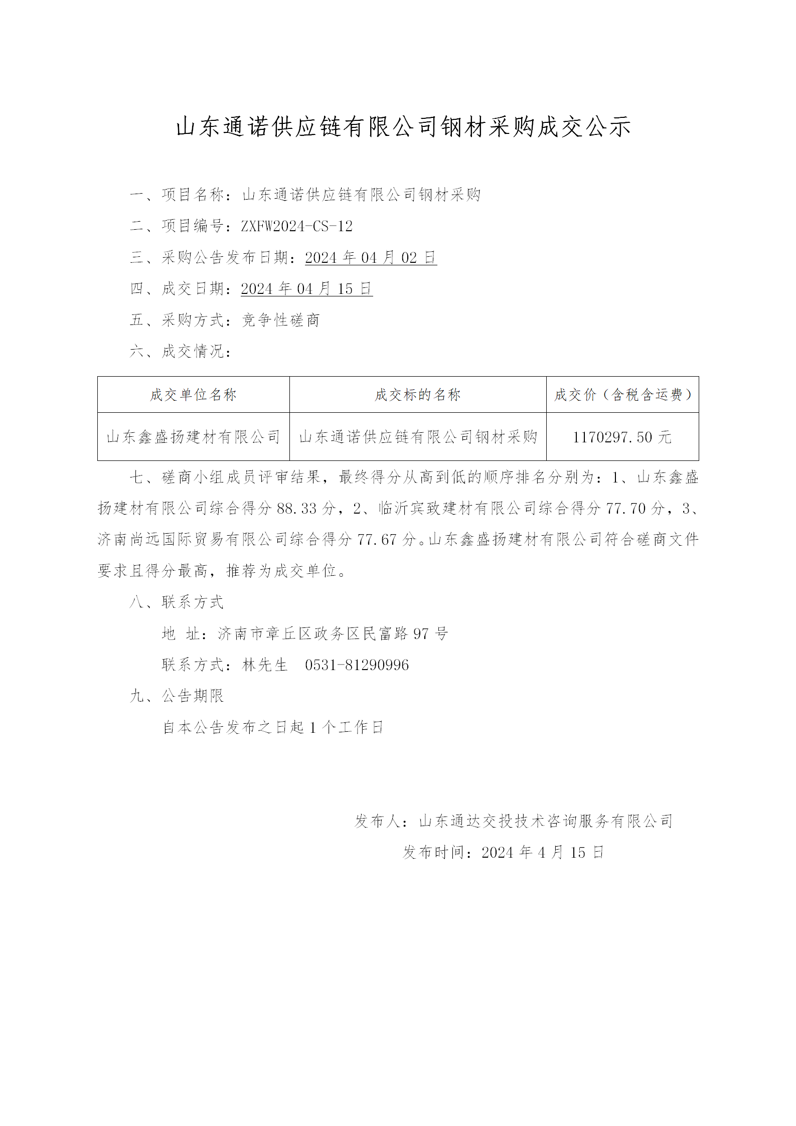山東通諾供應鏈有限公司鋼材采購成交公示