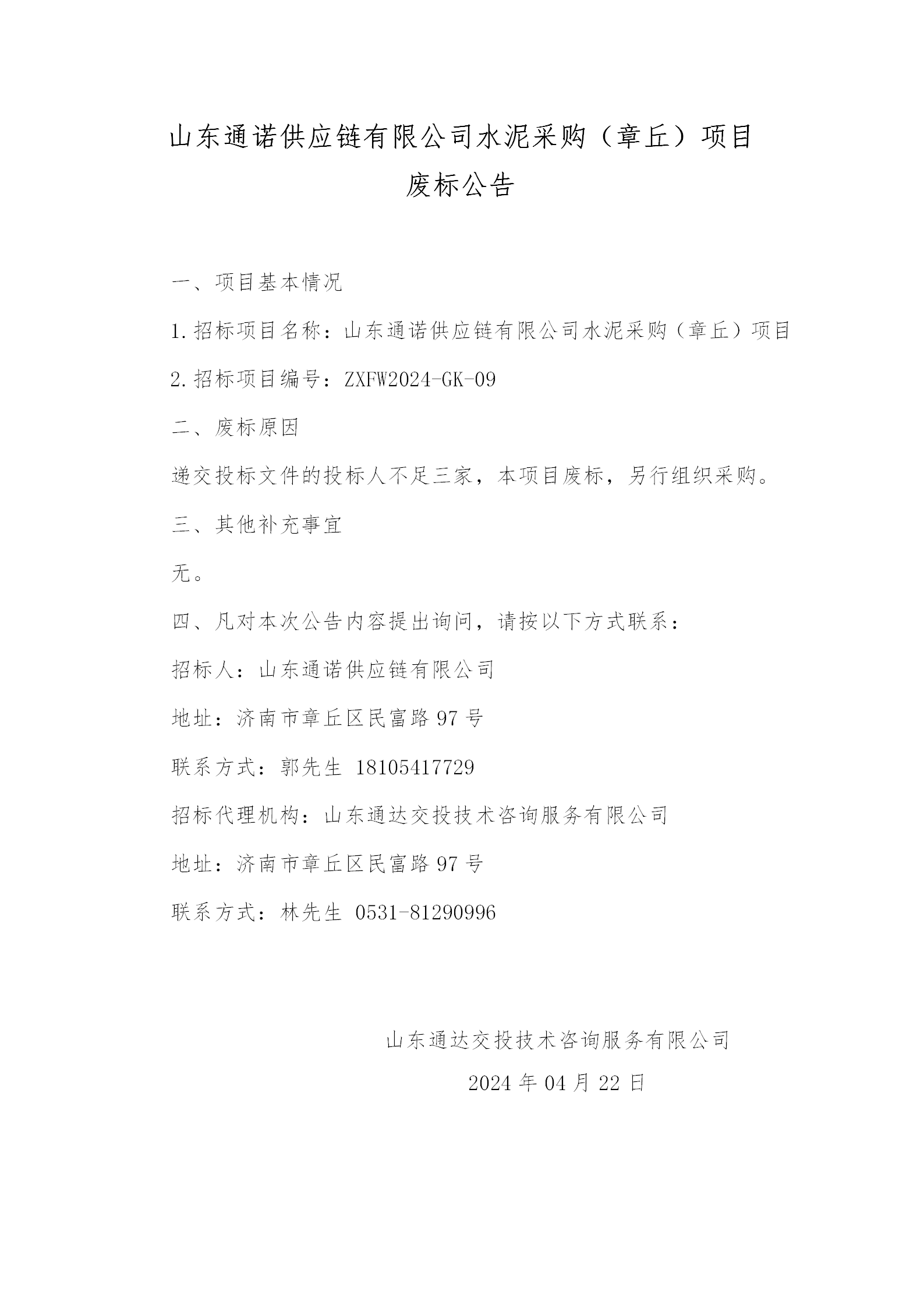 山東通諾供應(yīng)鏈有限公司水泥采購(章丘)項(xiàng)目 廢標(biāo)公告