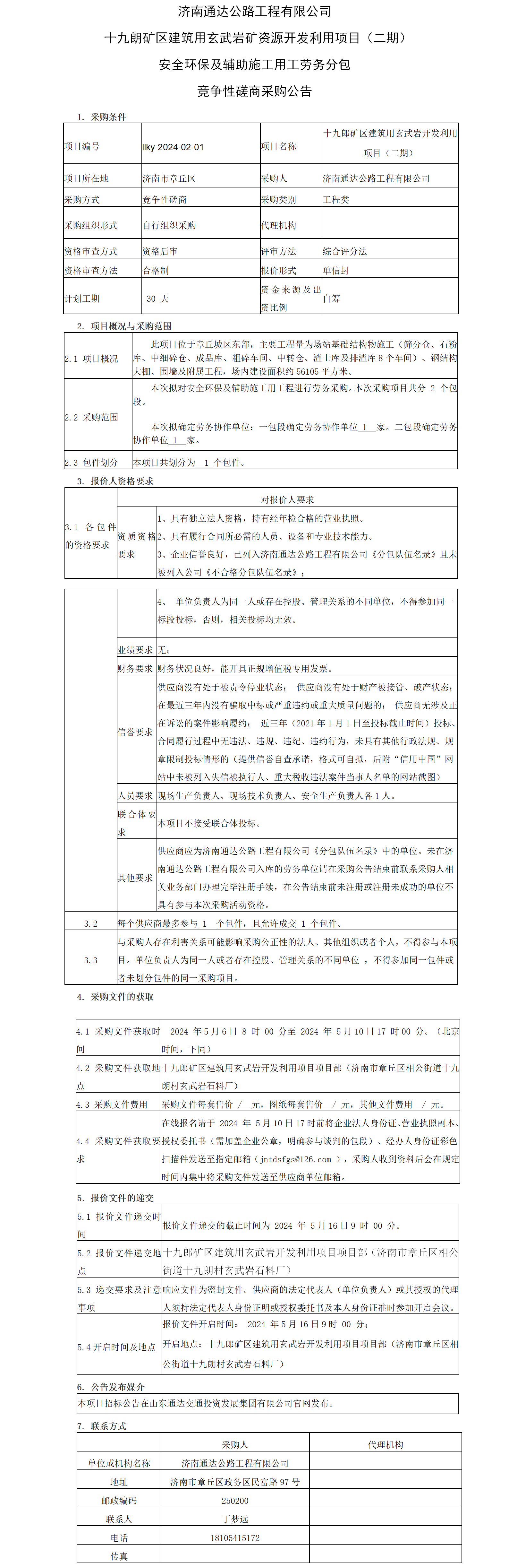濟南通達公路工程有限公司 十九朗礦區(qū)建筑用玄武巖礦資源開發(fā)利用項目(二期) 安全環(huán)保及輔助施工用工勞務分包 競爭性磋商采購公告