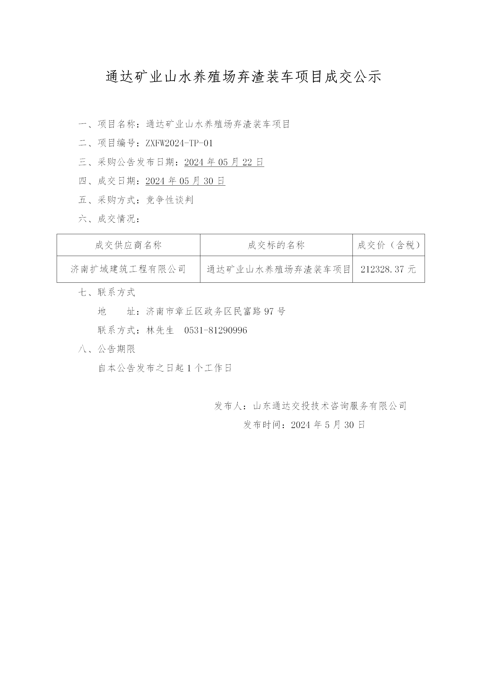 通達(dá)礦業(yè)山水養(yǎng)殖場(chǎng)棄渣裝車項(xiàng)目成交公示
