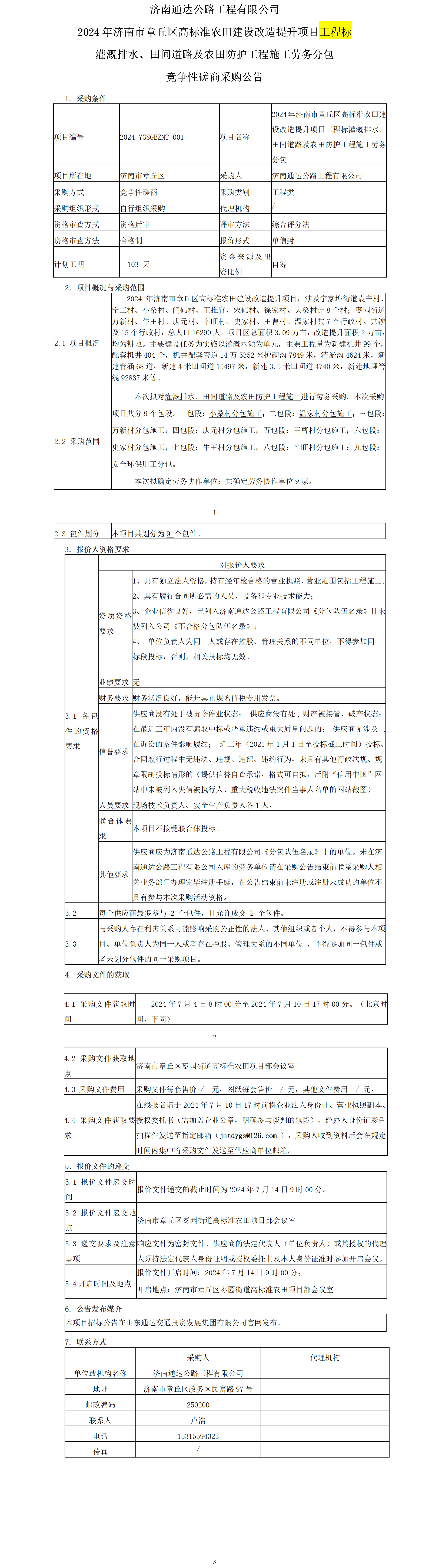 濟(jì)南通達(dá)公路工程有限公司 2024年濟(jì)南市章丘區(qū)高標(biāo)準(zhǔn)農(nóng)田建設(shè)改造提升項(xiàng)目工程標(biāo) 灌溉排水、田間道路及農(nóng)田防護(hù)工程施工勞務(wù)分包 競(jìng)爭(zhēng)性磋商采購公告
