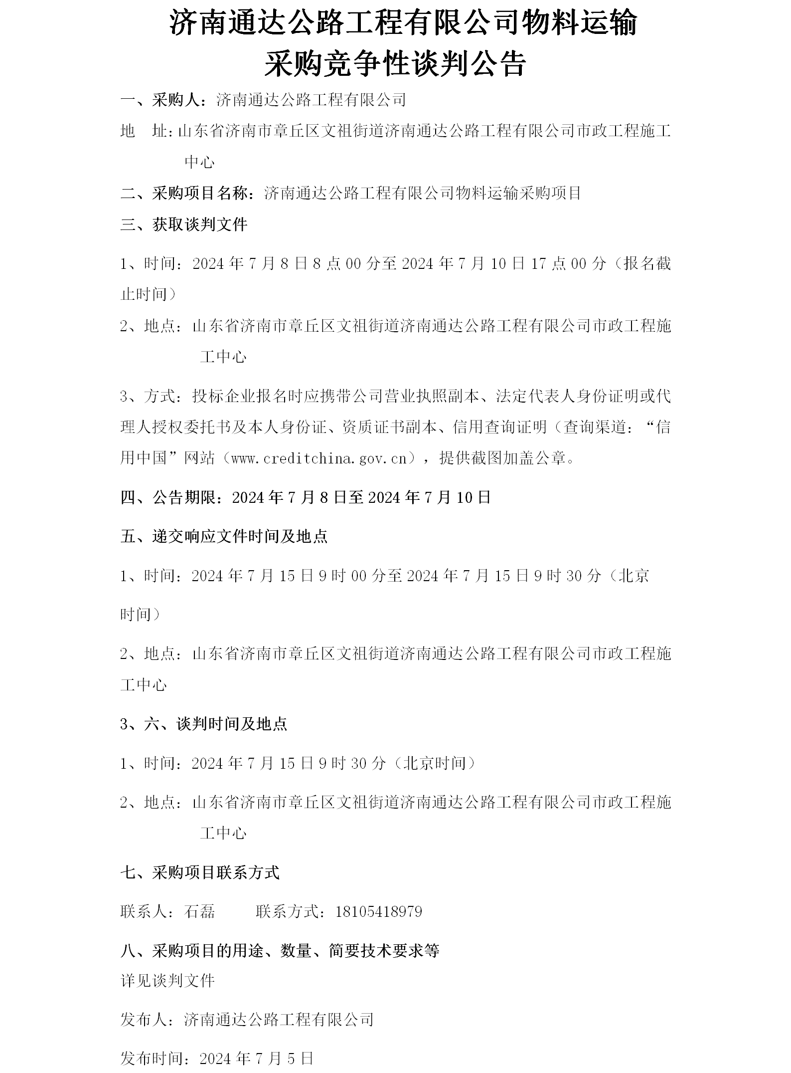 濟(jì)南通達(dá)公路工程有限公司物料運(yùn)輸 采購(gòu)競(jìng)爭(zhēng)性談判公告