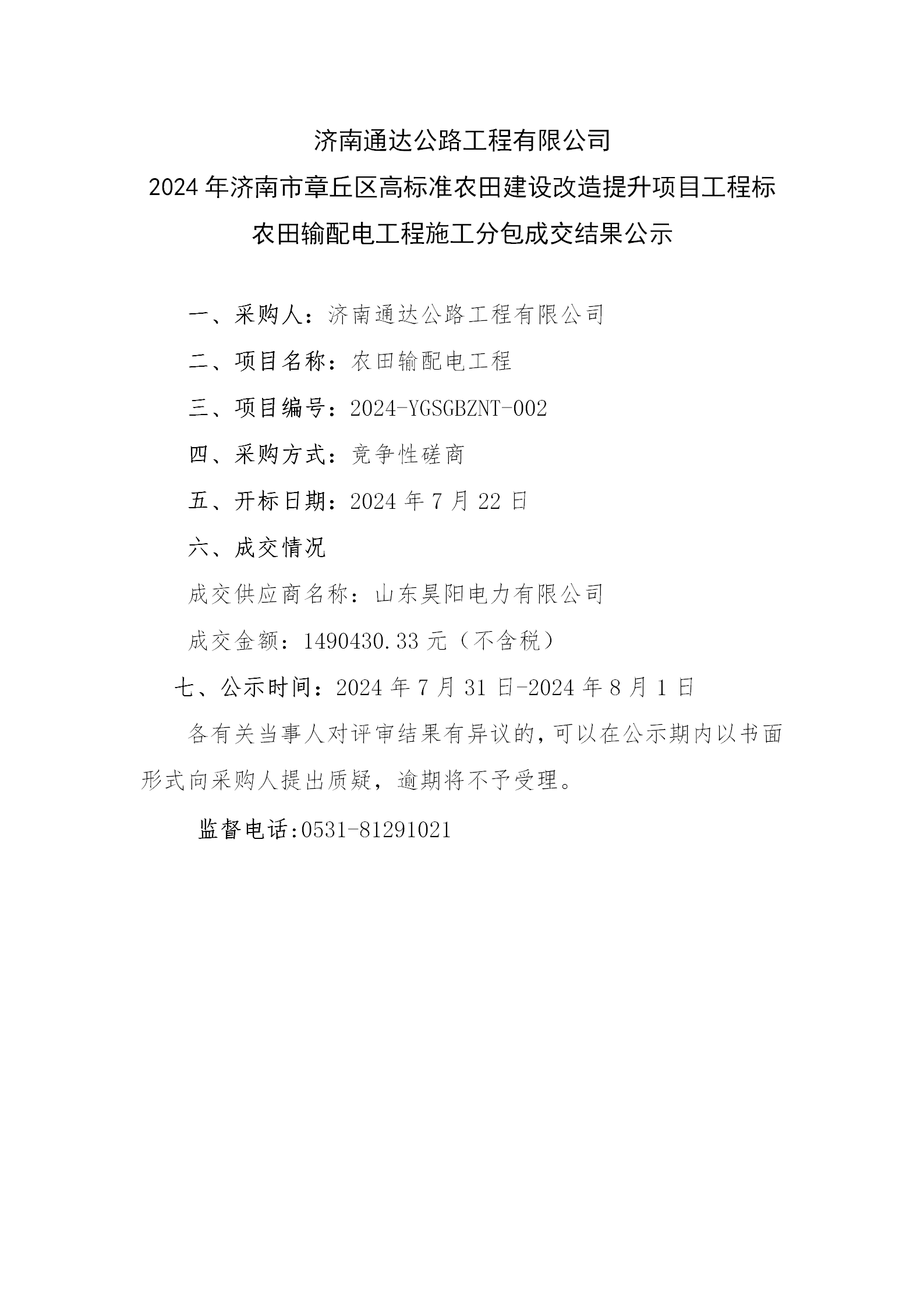 濟(jì)南通達(dá)公路工程有限公司 2024年濟(jì)南市章丘區(qū)高標(biāo)準(zhǔn)農(nóng)田建設(shè)改造提升項(xiàng)目工程標(biāo) 農(nóng)田輸配電工程施工分包成交結(jié)果公示