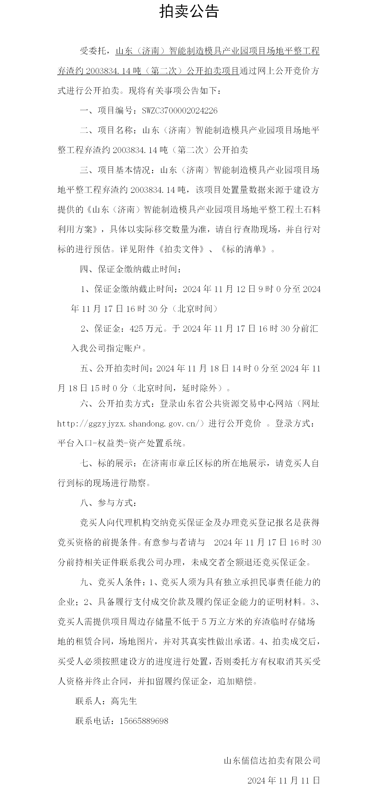 山東(濟(jì)南)智能制造模具產(chǎn)業(yè)園項目場地平整工程棄渣約2003834.14噸(第二次)公開拍賣