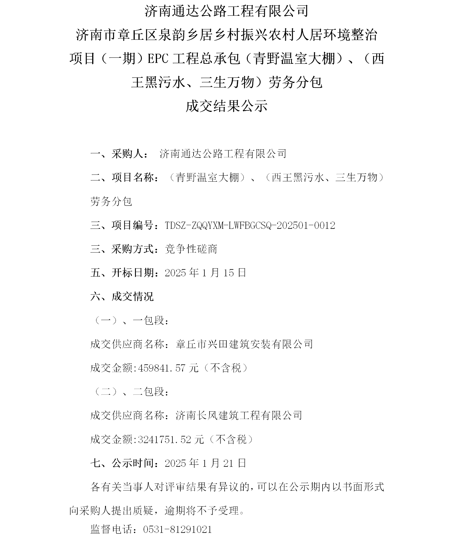 濟南通達公路工程有限公司 濟南市章丘區(qū)泉韻鄉(xiāng)居鄉(xiāng)村振興農(nóng)村人居環(huán)境整治項目(一期)EPC工程總承包(青野溫室大棚)、(西王黑污水、三生萬物)勞務(wù)分包 成交結(jié)果公示