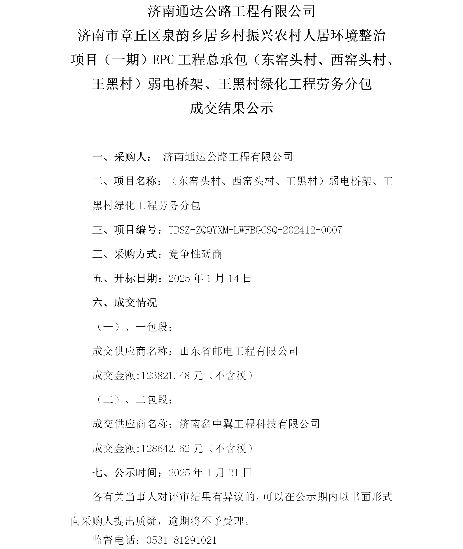 濟南通達公路工程有限公司 濟南市章丘區(qū)泉韻鄉(xiāng)居鄉(xiāng)村振興農(nóng)村人居環(huán)境整治項目(一期)EPC工程總承包(東窯頭村、西窯頭村、王黑村)弱電橋架、王黑村綠化工程勞務分包 成交結果公示
