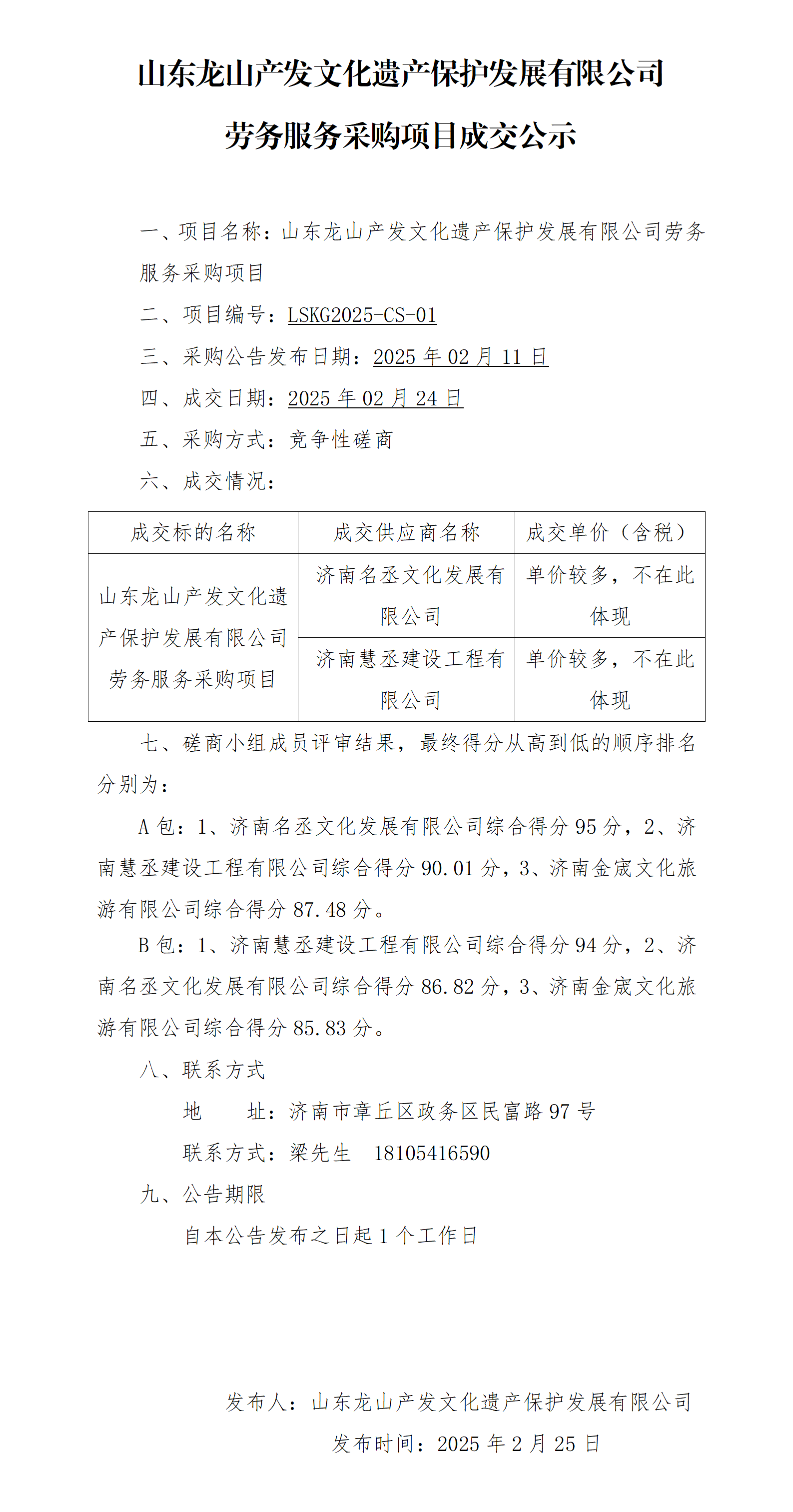 山東龍山產(chǎn)發(fā)文化遺產(chǎn)保護發(fā)展有限公司勞務(wù)服務(wù)采購項目成交公示