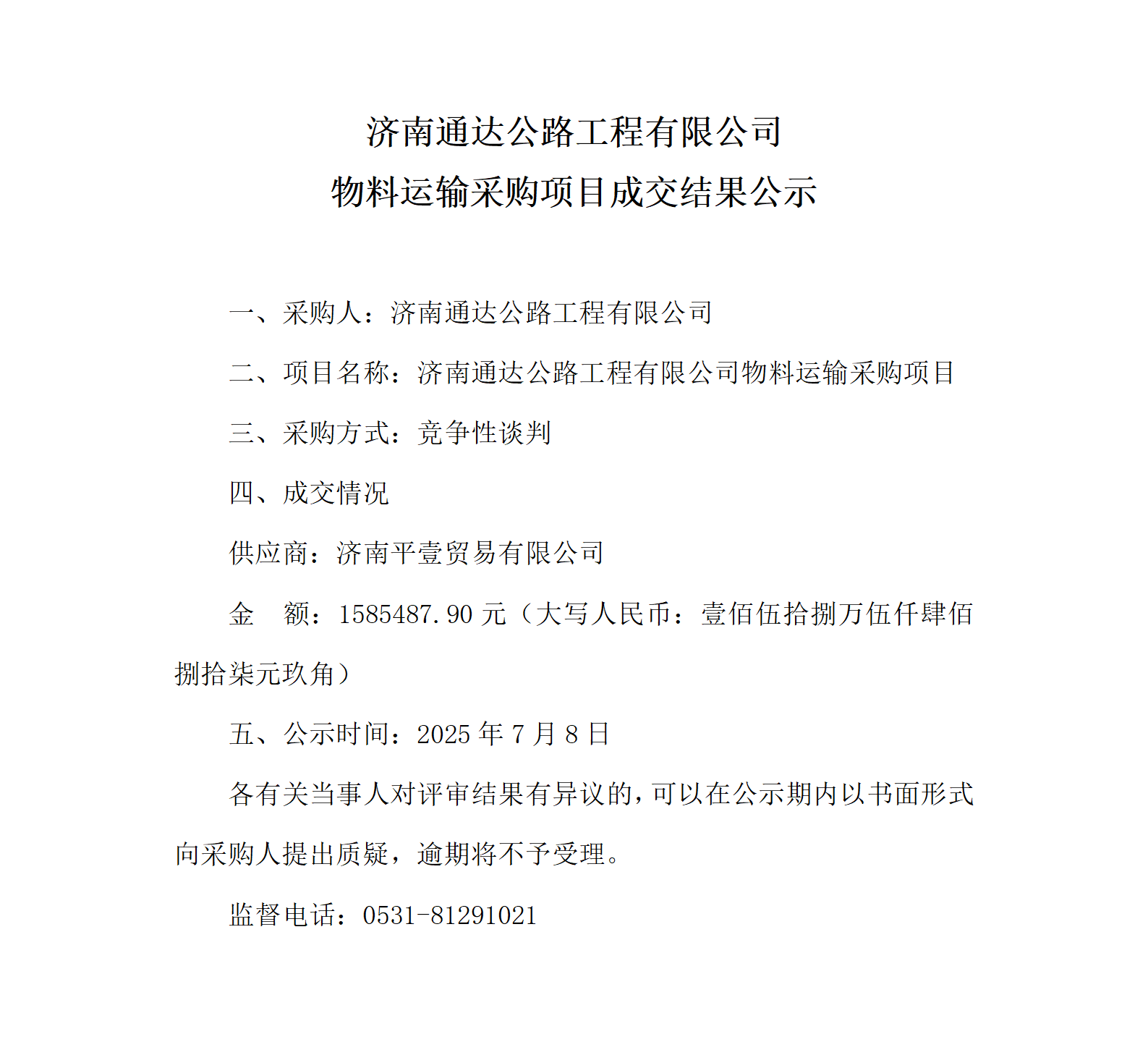 濟(jì)南通達(dá)公路工程有限公司物料運(yùn)輸采購(gòu)項(xiàng)目成交結(jié)果公示