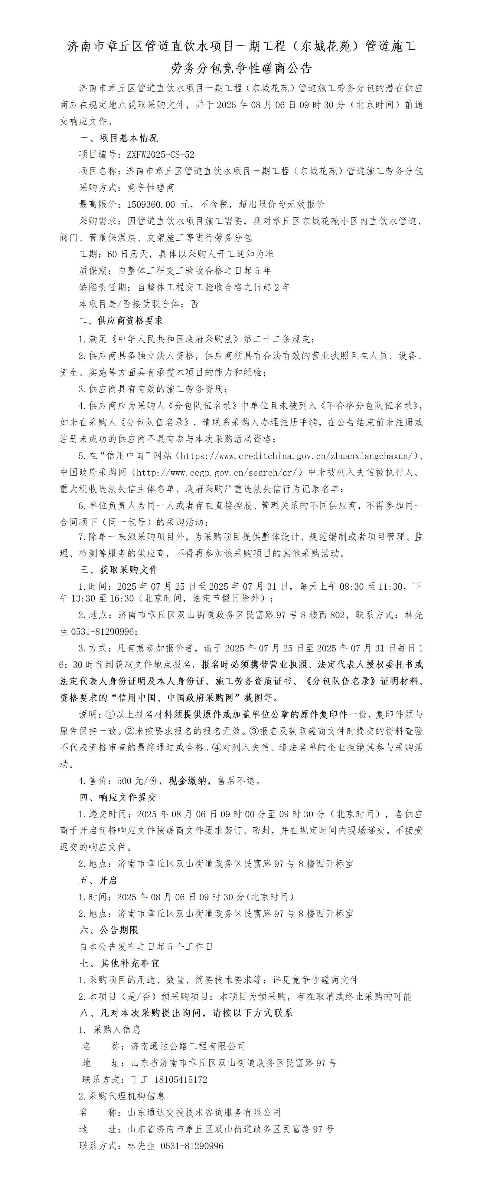 濟(jì)南市章丘區(qū)管道直飲水項(xiàng)目一期工程(東城花苑)管道施工勞務(wù)分包競(jìng)爭(zhēng)性磋商公告