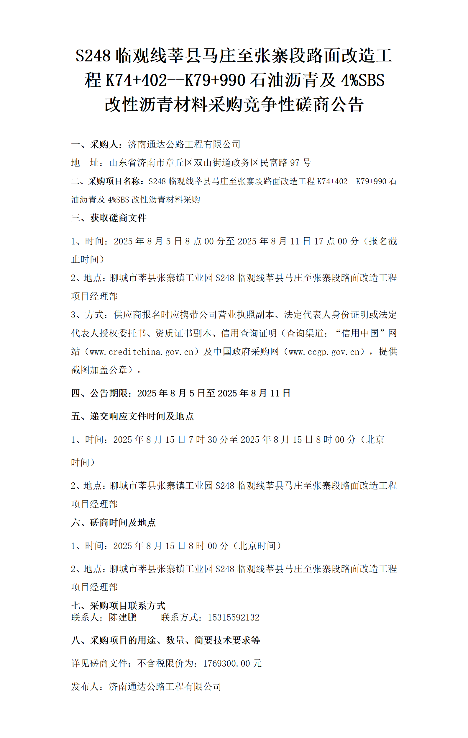 S248臨觀線莘縣馬莊至張寨段路面改造工程K74+402--K79+990石油瀝青及4%SBS改性瀝青材料采購競爭性磋商公告