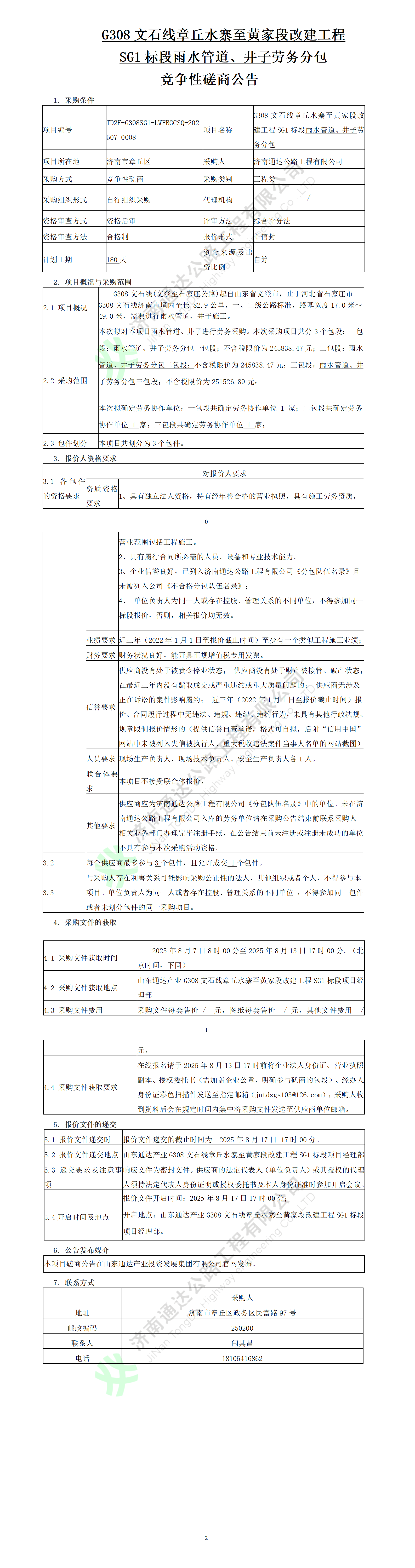 G308文石線章丘水寨至黃家段改建工程SG1標(biāo)段雨水管道、井子勞務(wù)分包競(jìng)爭(zhēng)性磋商公告