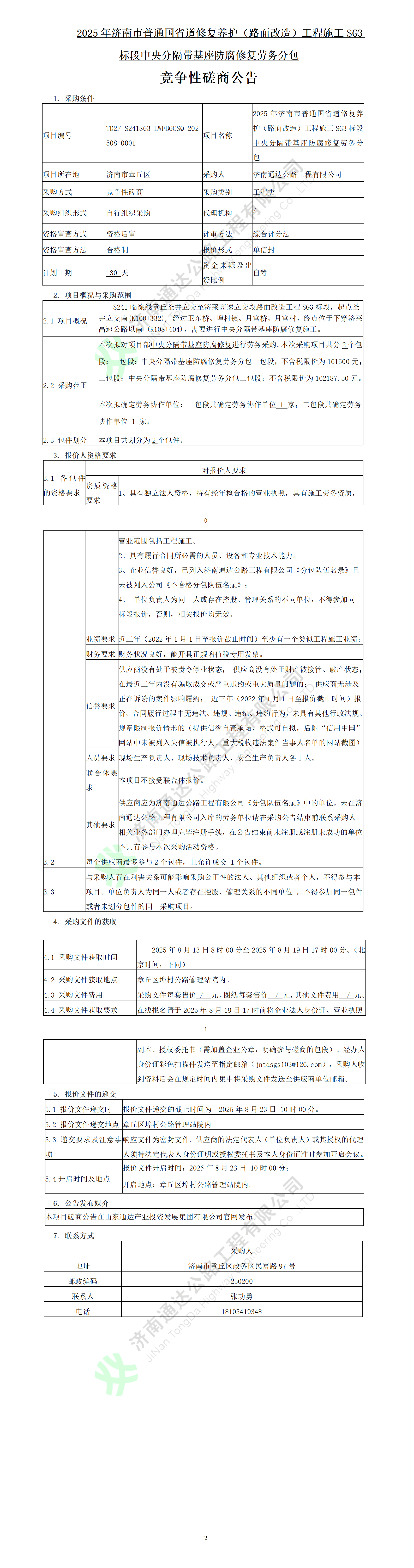 2025年濟南市普通國省道修復養(yǎng)護(路面改造)工程施工SG3標段中央分隔帶基座防腐修復勞務分包競爭性磋商公告