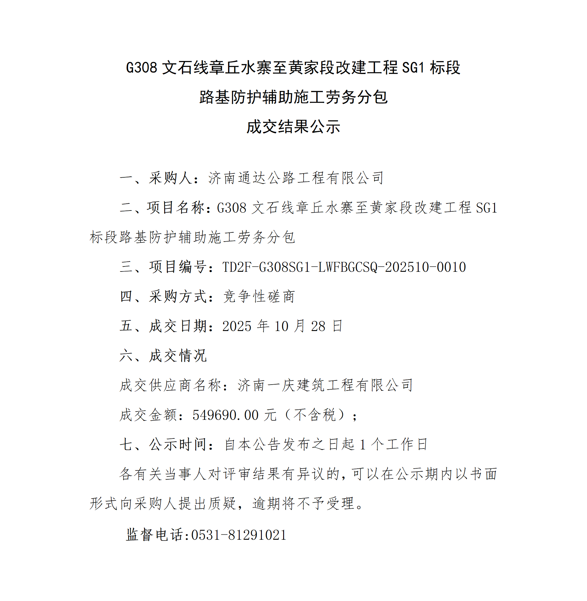G308文石線(xiàn)章丘水寨至黃家段改建工程SG1標(biāo)段路基防護(hù)輔助施工勞務(wù)分包成交結(jié)果公示