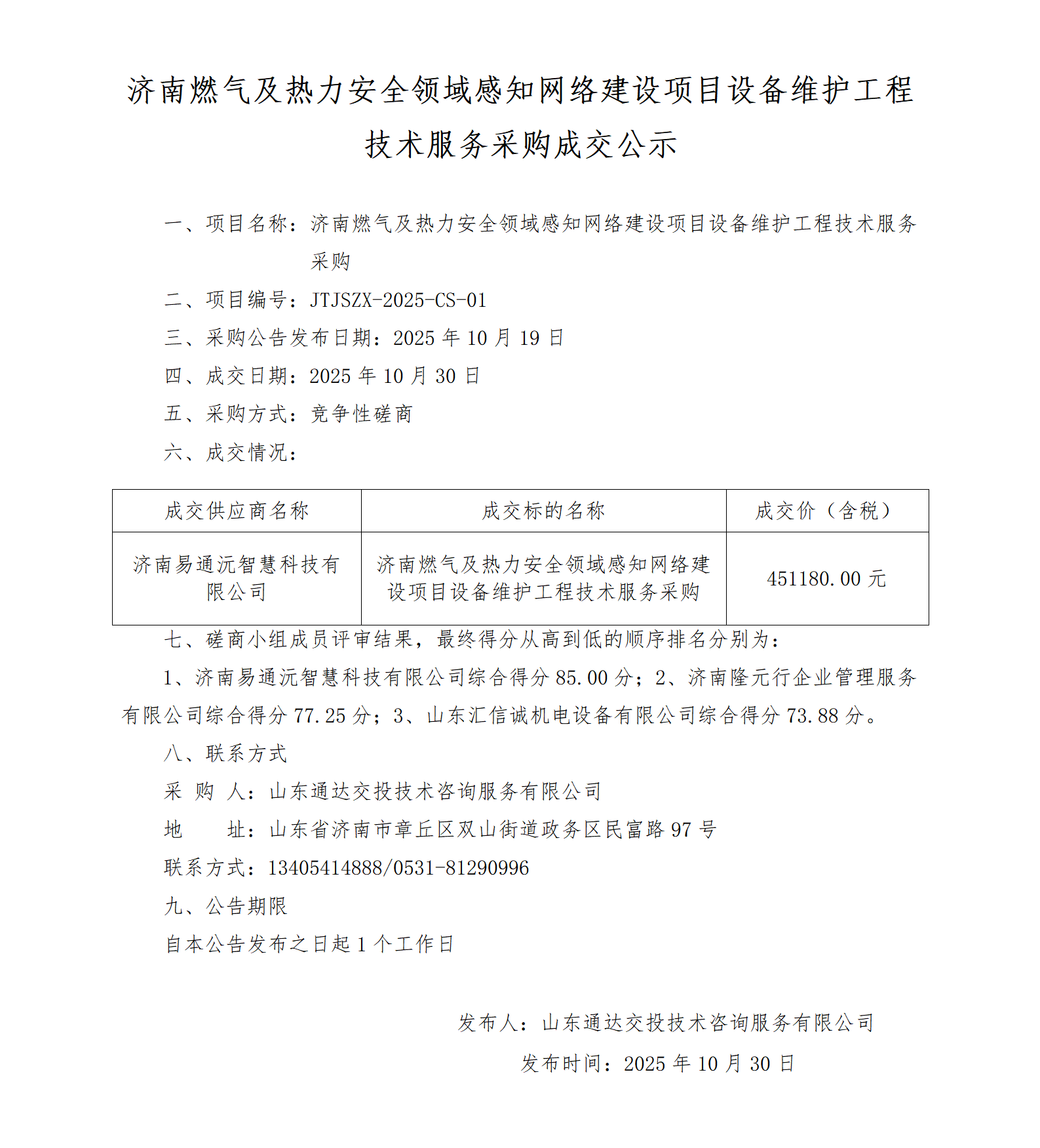 濟(jì)南燃?xì)饧盁崃Π踩I(lǐng)域感知網(wǎng)絡(luò)建設(shè)項(xiàng)目設(shè)備維護(hù)工程技術(shù)服務(wù)采購成交公示
